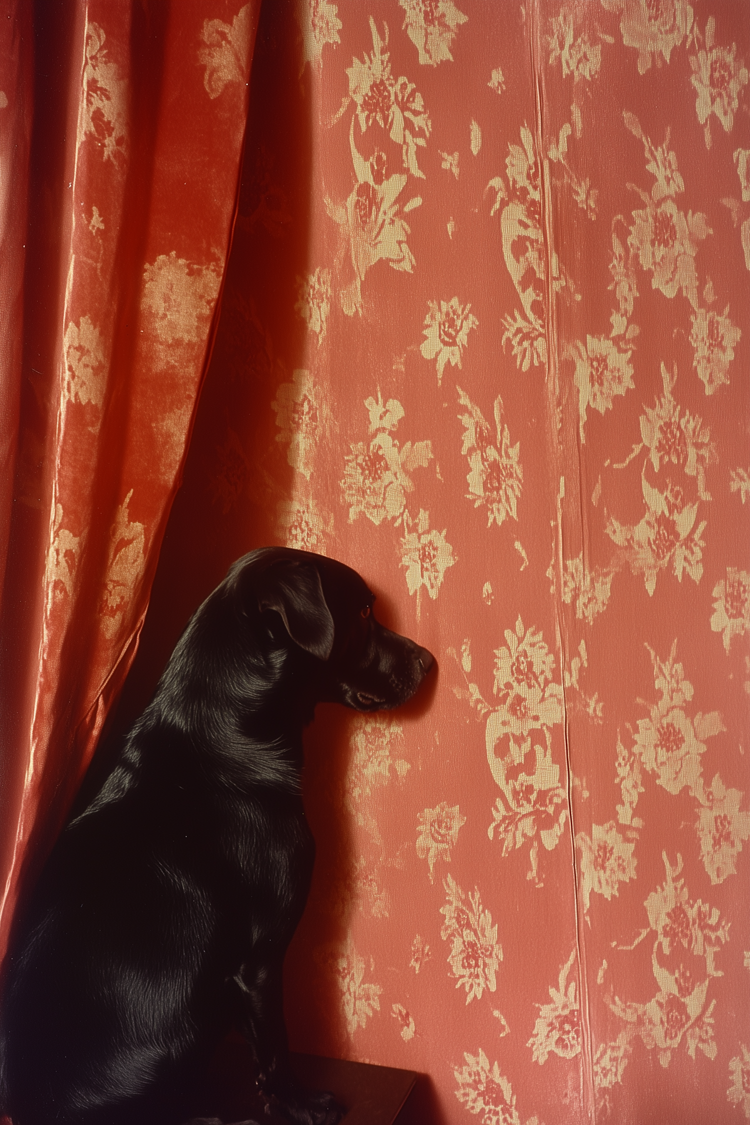 A black dog sits facing a red floral-patterned wall, creating a striking contrast with its glossy coat.