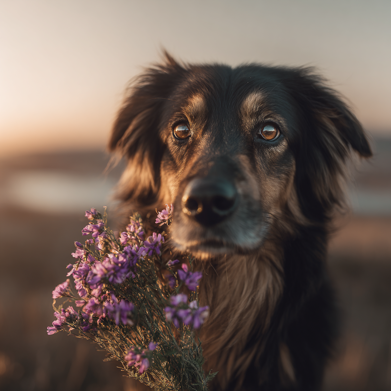 A close-up of a dog holding purple flowers in its mouth, set against a warm, blurred sunset background.