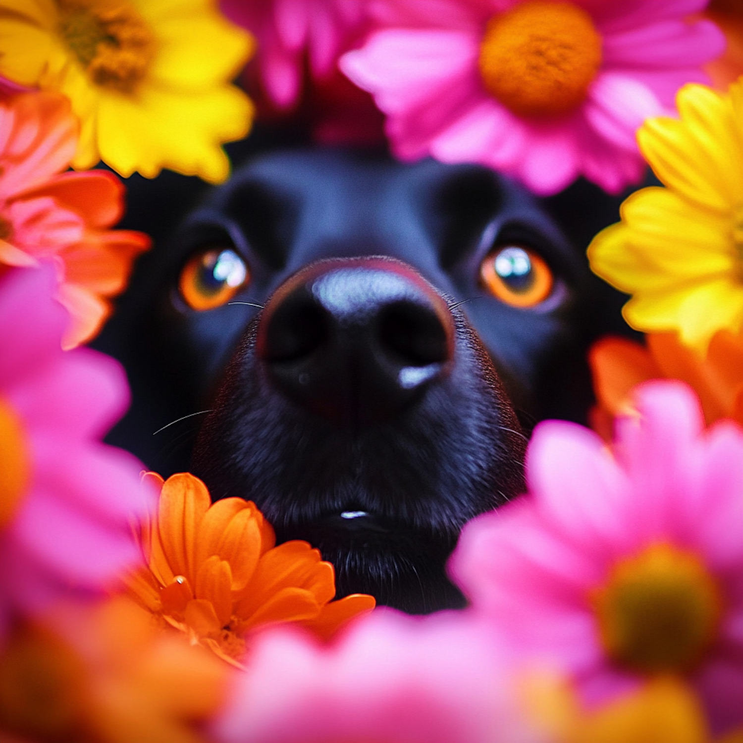 Adorable black dog peeking through vibrant pink, orange, and yellow flowers, creating a playful and colorful close-up.