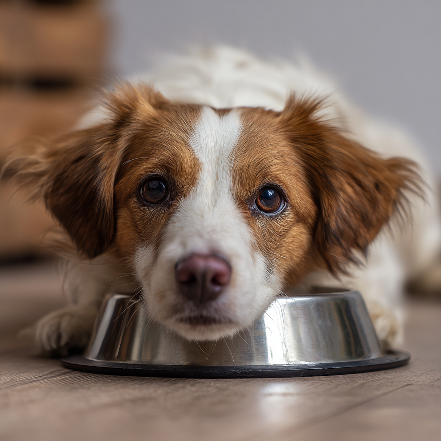 A cute brown and white dog rests its head on a metal bowl, gazing up with expressive eyes, creating a heartwarming moment.