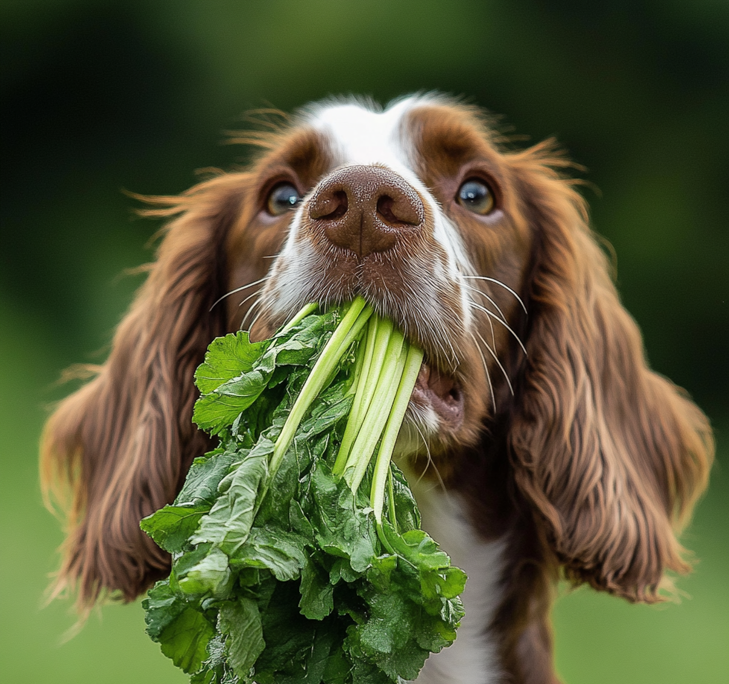 Adorable brown and white dog with floppy ears holding leafy greens in its mouth, set against a blurred green background.