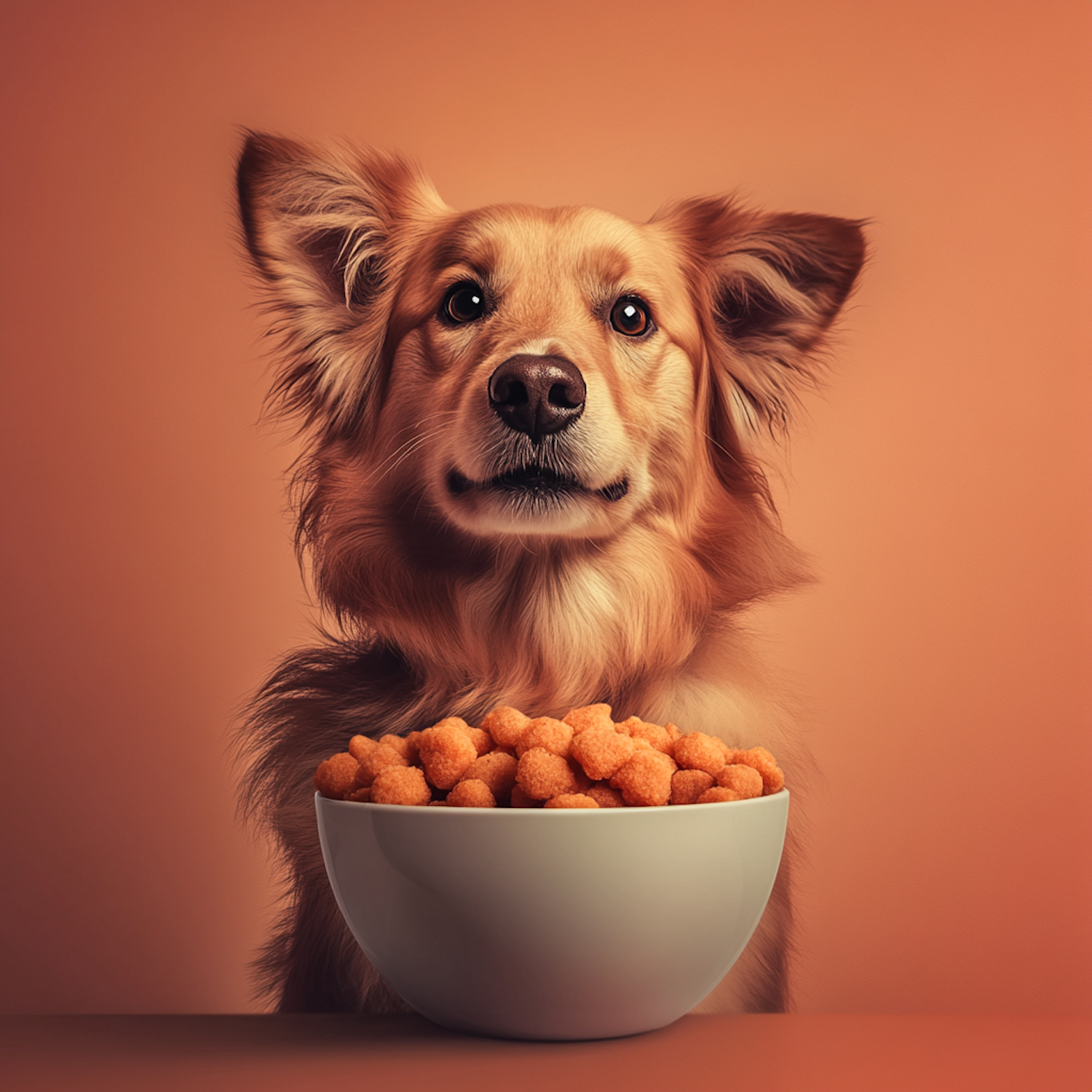 Golden retriever with a bowl of orange dog treats against a warm orange background, creating a cozy and inviting scene.
