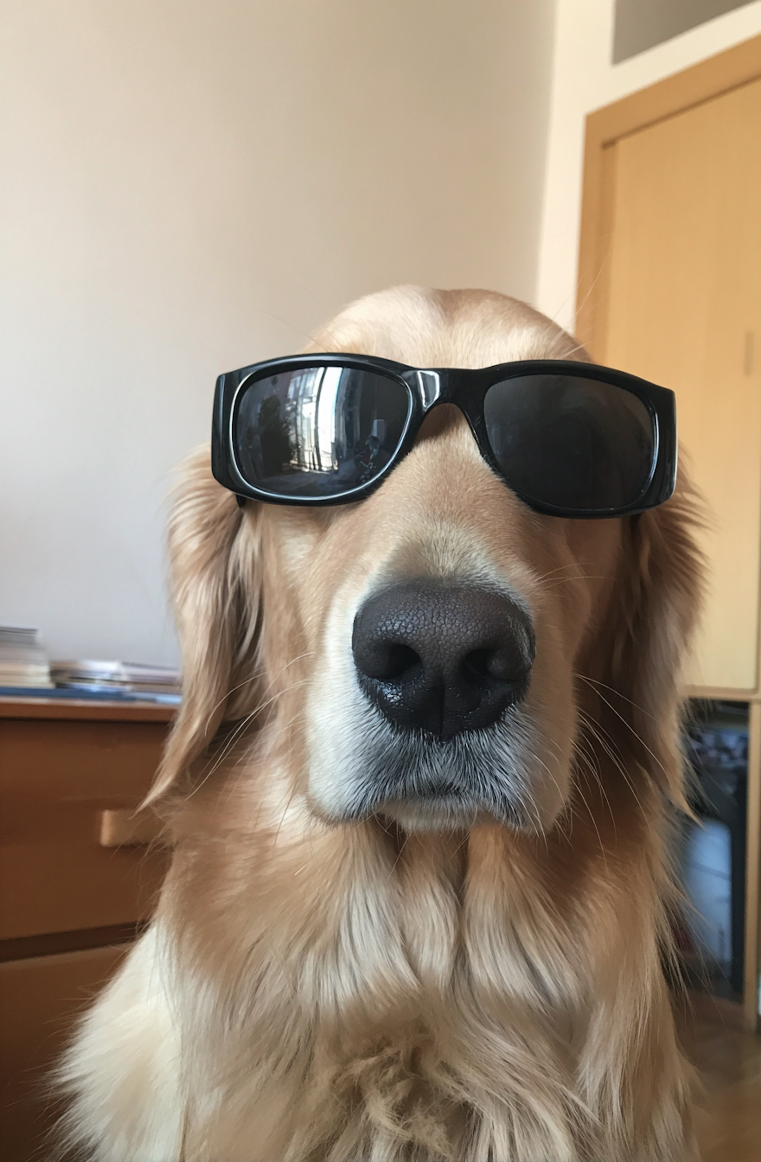 A golden retriever wearing black sunglasses indoors, creating a funny and charming moment. The background includes furniture and books.