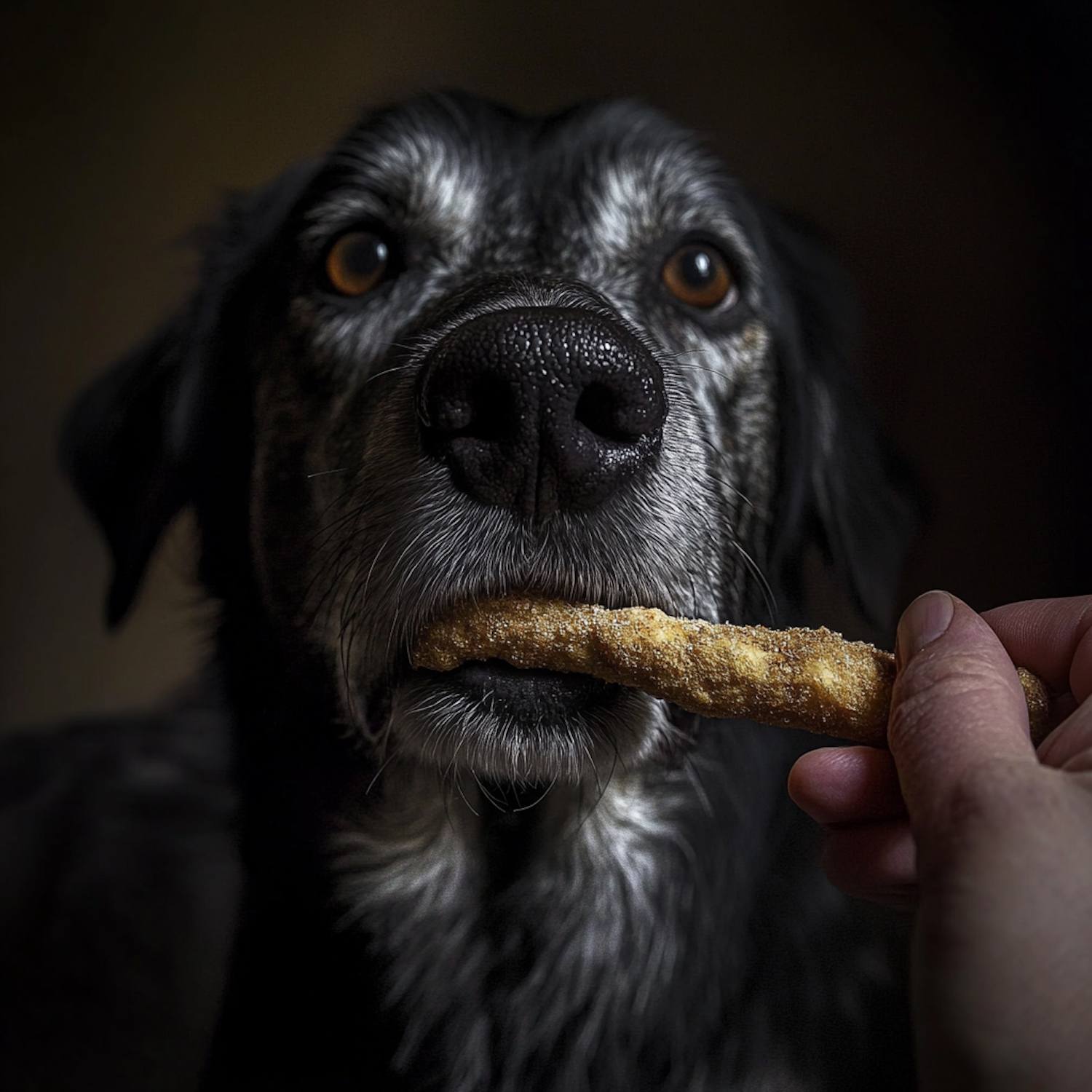 Close-up of a black and gray dog eagerly taking a treat from a human hand, with a focus on the dog's expressive eyes and nose.