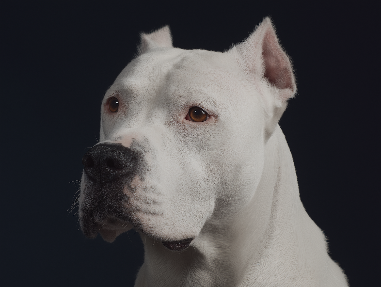 Close-up of a cute Dogo Argentino with a white coat, cropped ears, and expressive brown eyes against a smooth dark background.