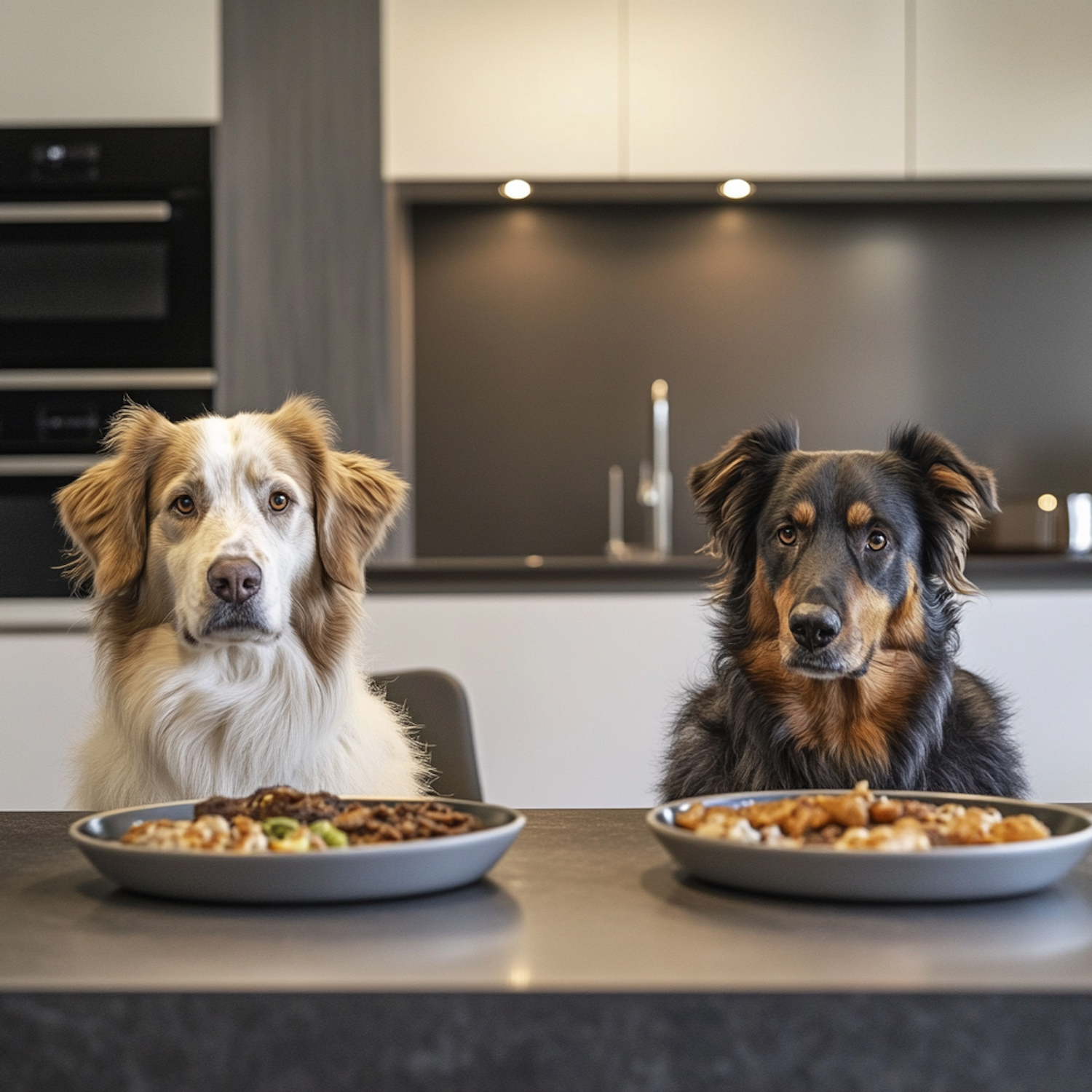 Two dogs sit at a table with plates of food in a modern kitchen, looking directly at the camera.
