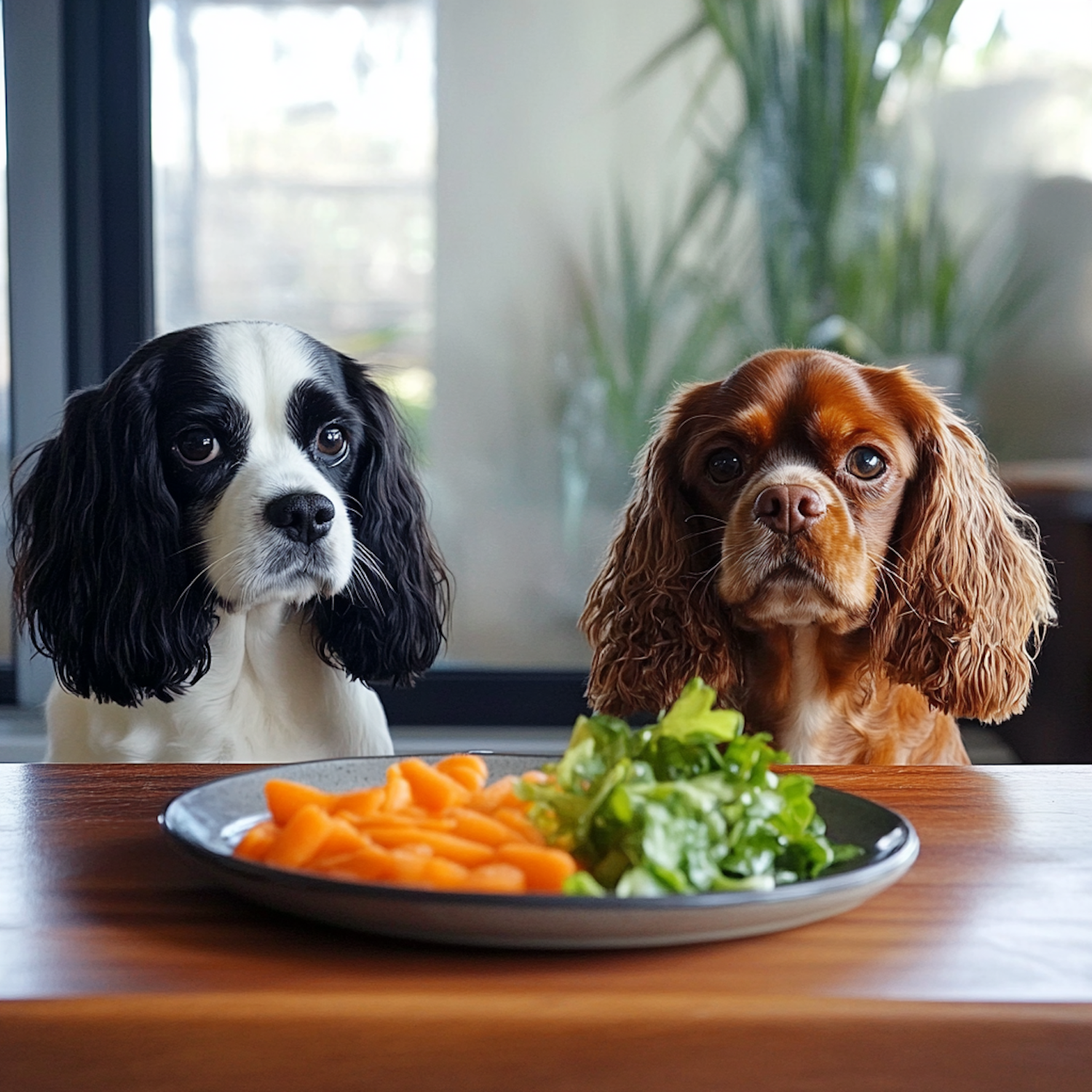 Two spaniels gaze at a plate of carrots and greens on a wooden table, with a cozy indoor setting in the background.