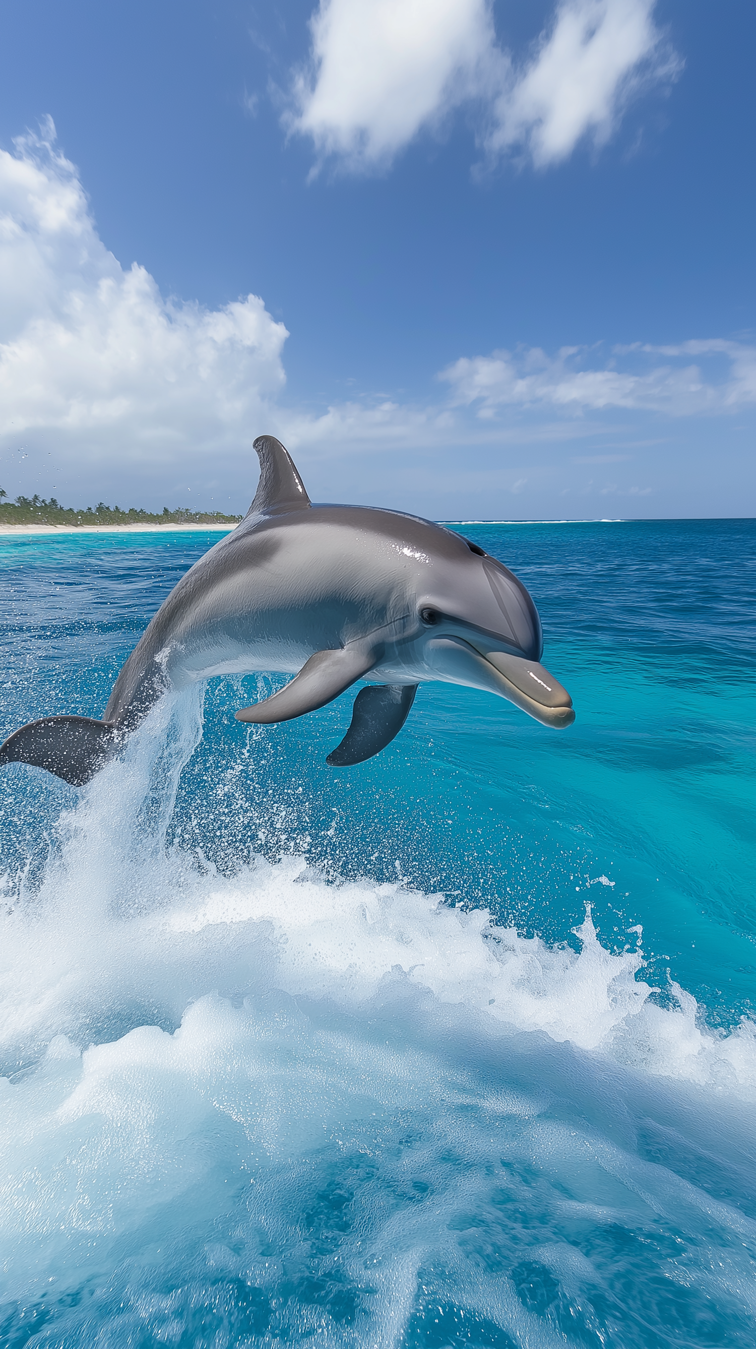 A dolphin leaps from turquoise waters under a bright blue sky, with a sandy beach and palm trees in the background.