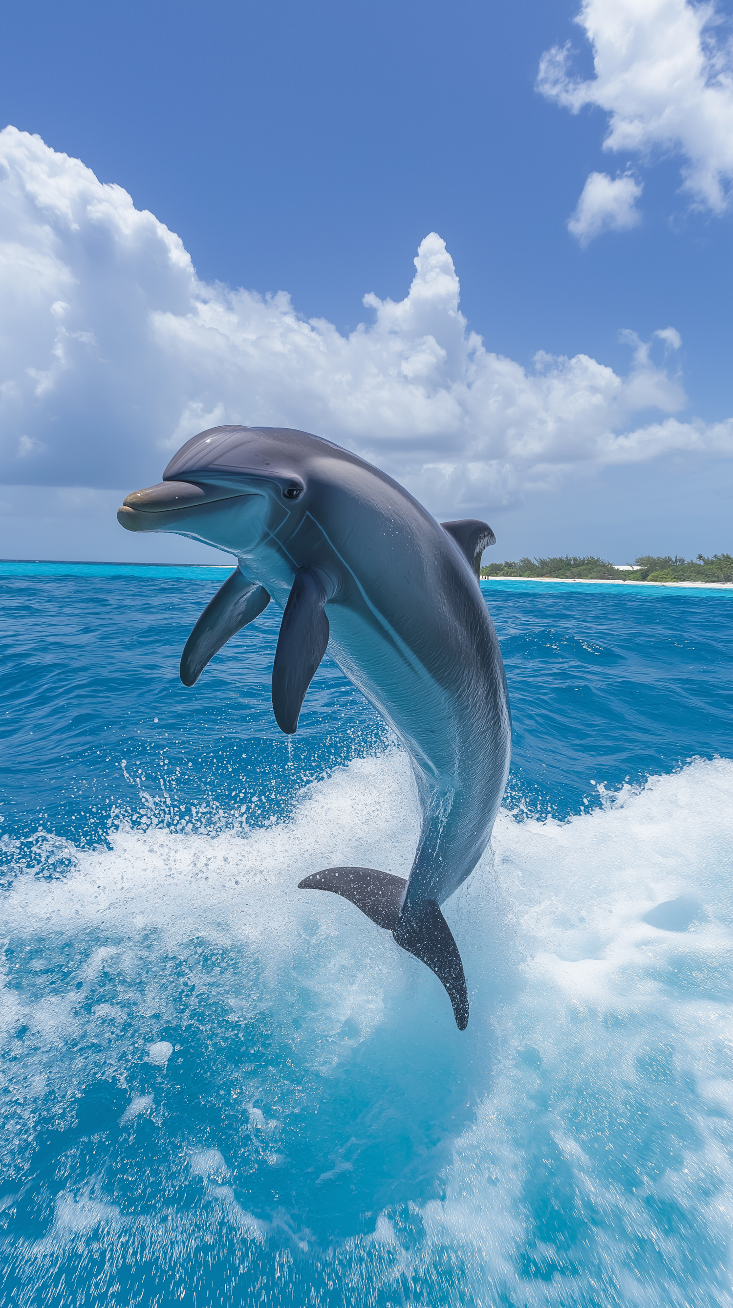 A dolphin leaps from the ocean against a bright blue sky, creating a splash in the vibrant sea. A stunning display of nature's beauty.