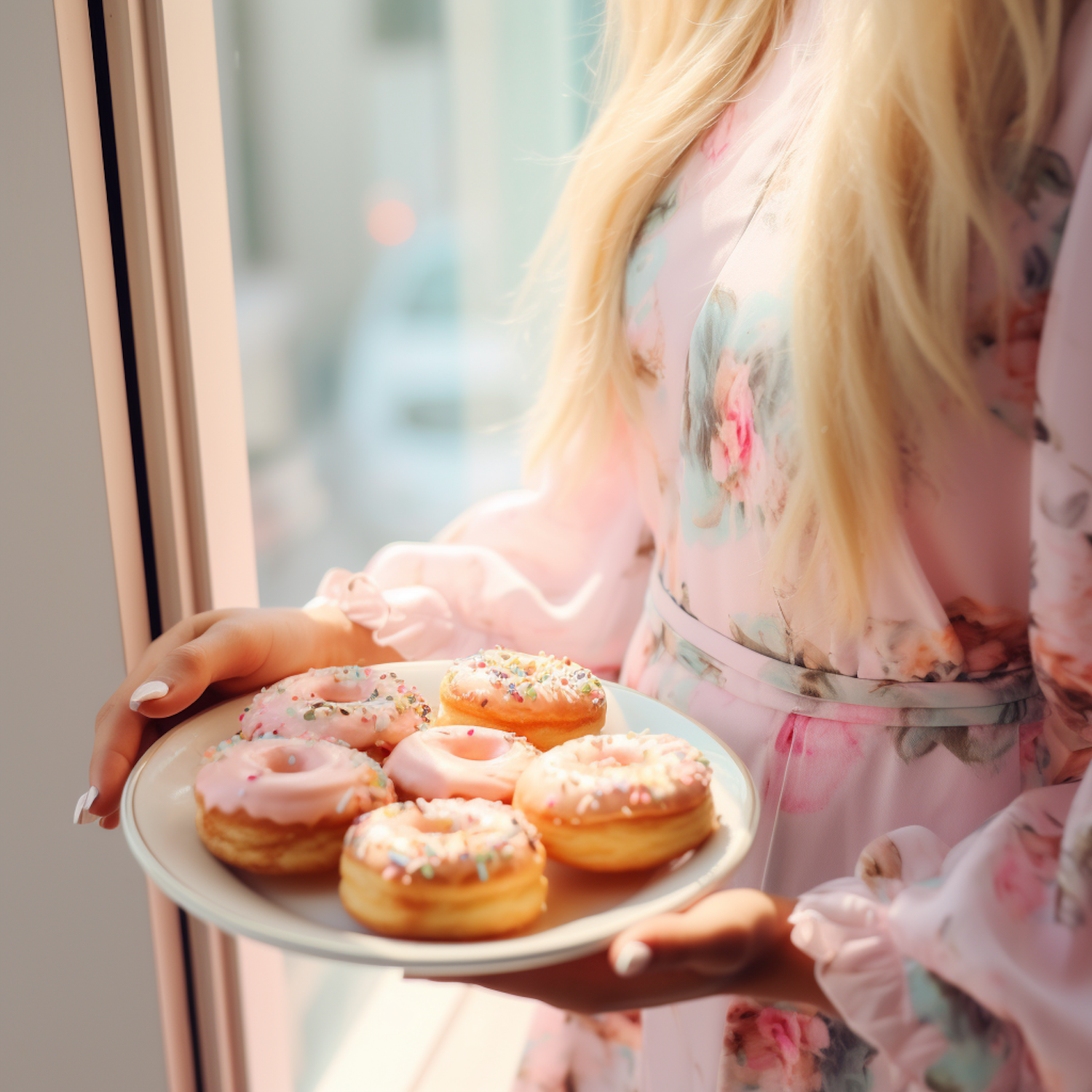 Blonde person in floral dress holding a plate of pink frosted donuts with sprinkles by a sunlit window.