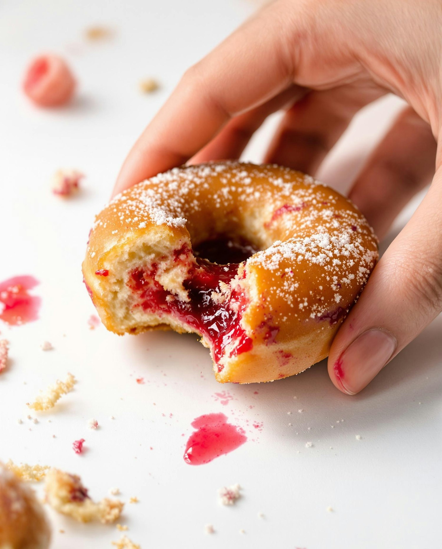 Hand holding a bitten donut with raspberry jam smeared on fingers and a white table. Bits of sugar and crumbs scattered. Shot like a casual photo caught mid-bite — raw and realistic.