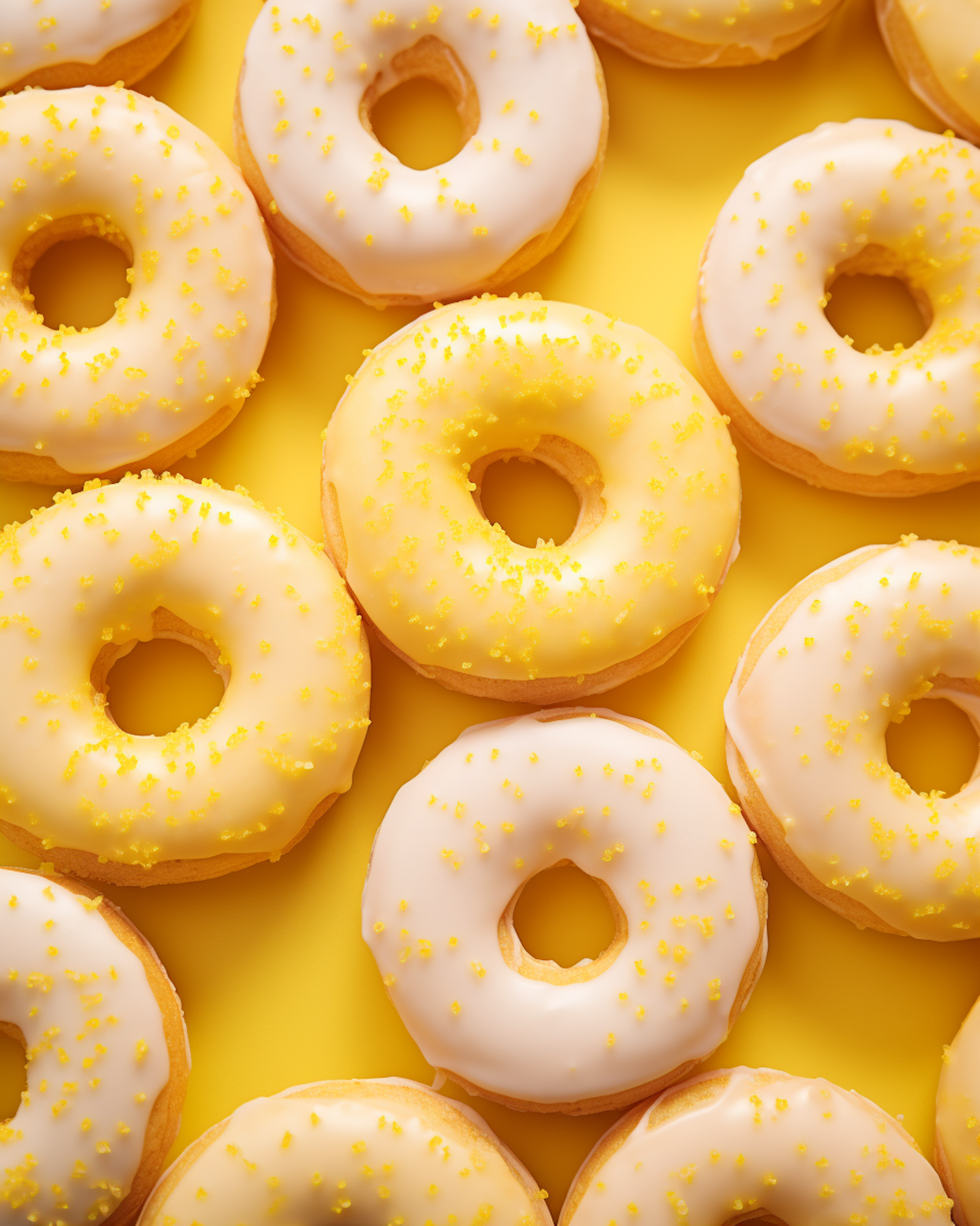Bright yellow and white donuts with sugar sprinkles on a yellow background, creating a cheerful and appetizing pattern.