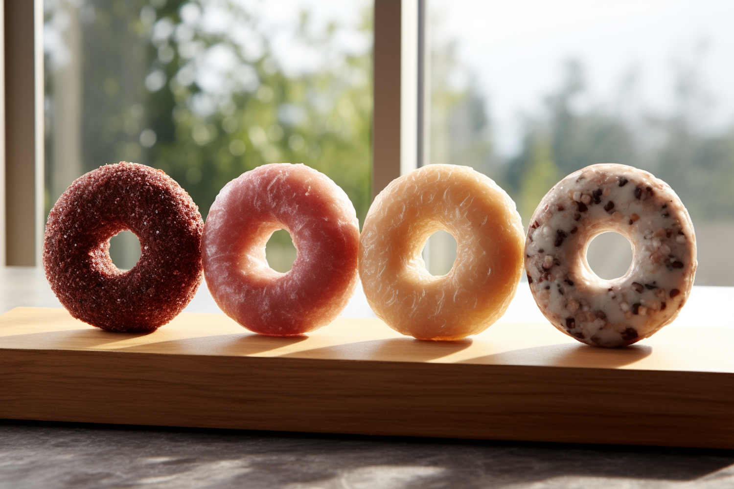 Four colorful donuts on a wooden board, each with unique glazes and textures, set against a sunny, blurred background.