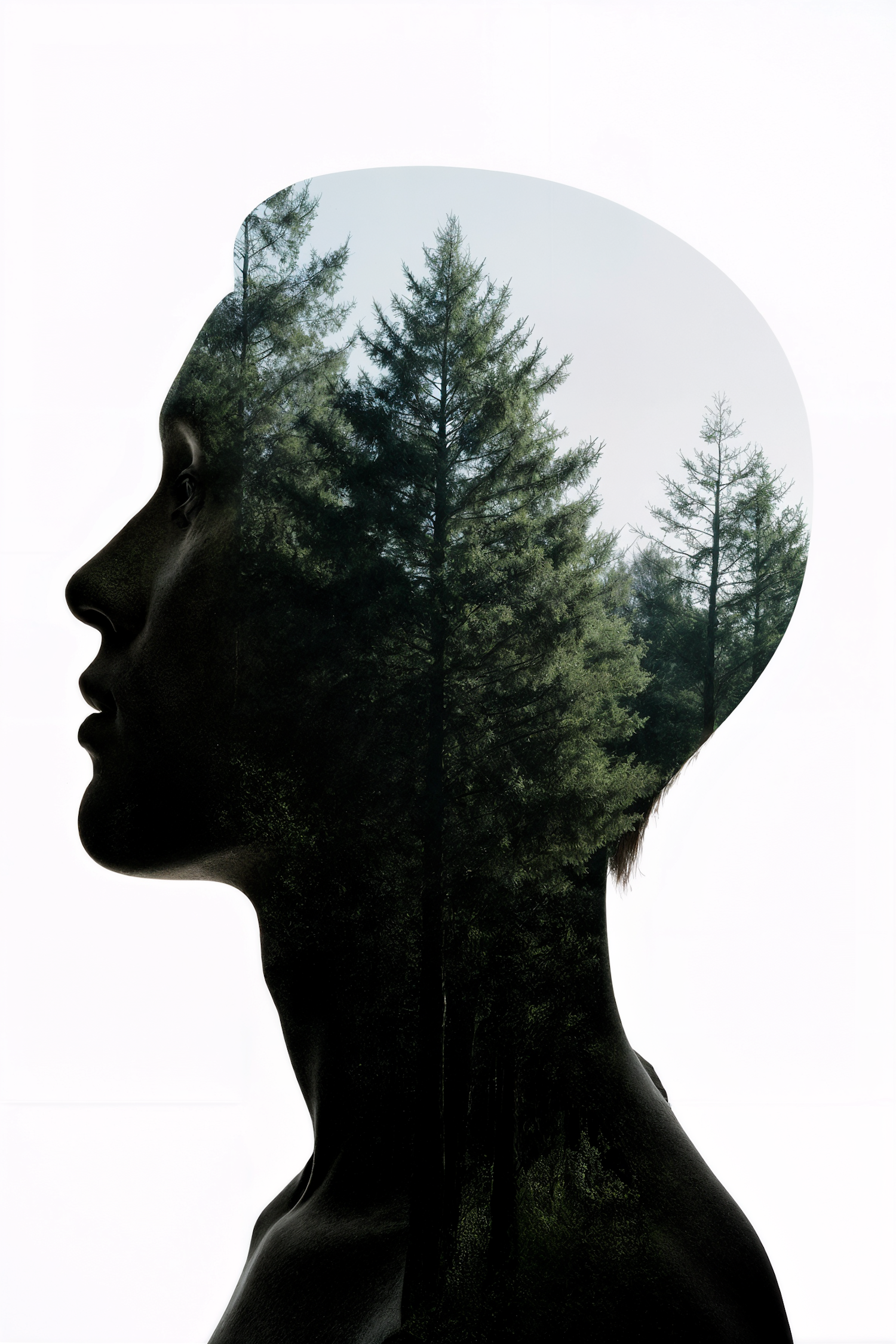 Double exposure art of a human profile filled with a serene forest scene, blending nature and humanity in a minimalist style.