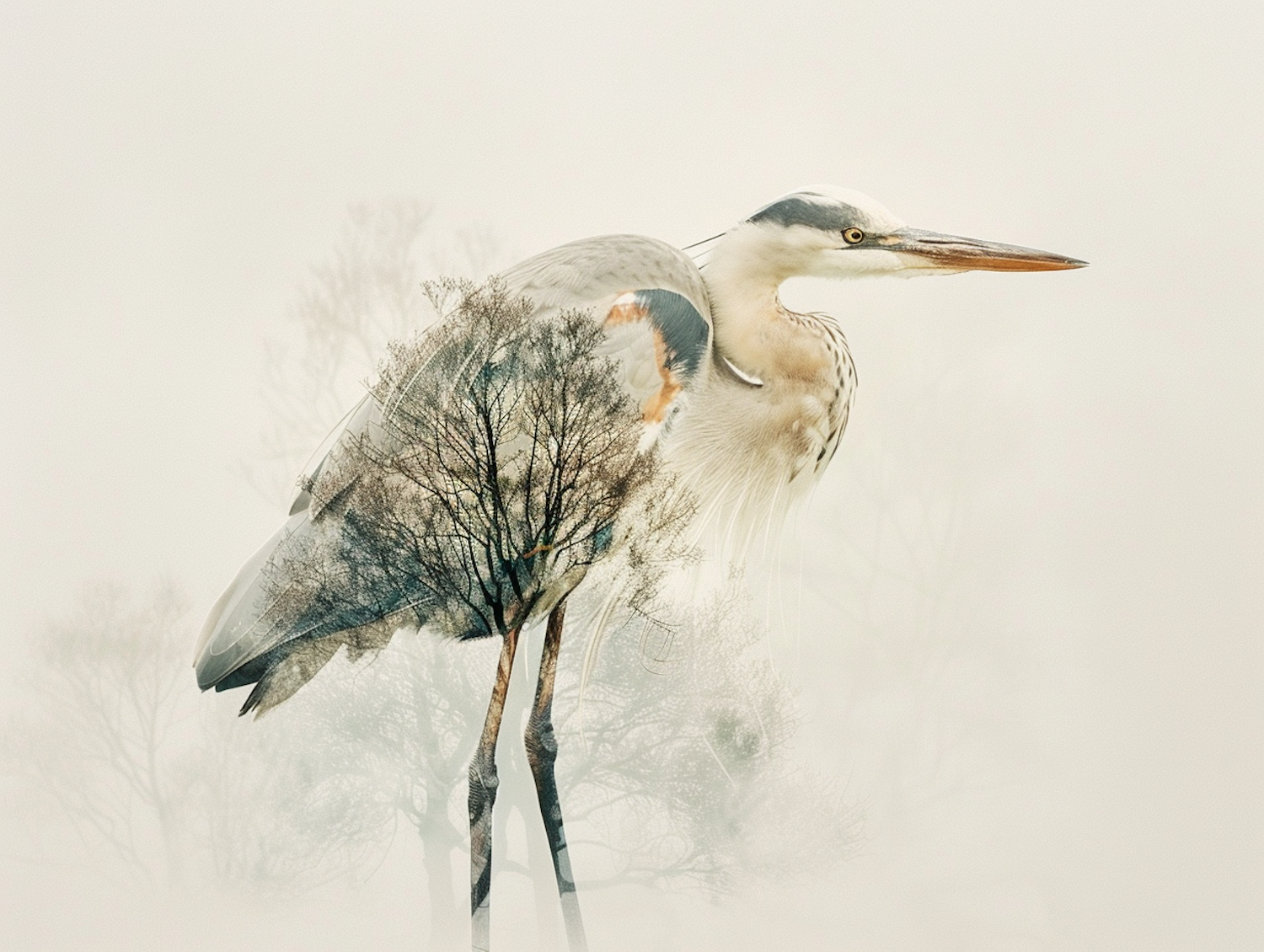 Artistic double exposure of a heron and tree, blending nature's elegance with surreal beauty in muted tones.
