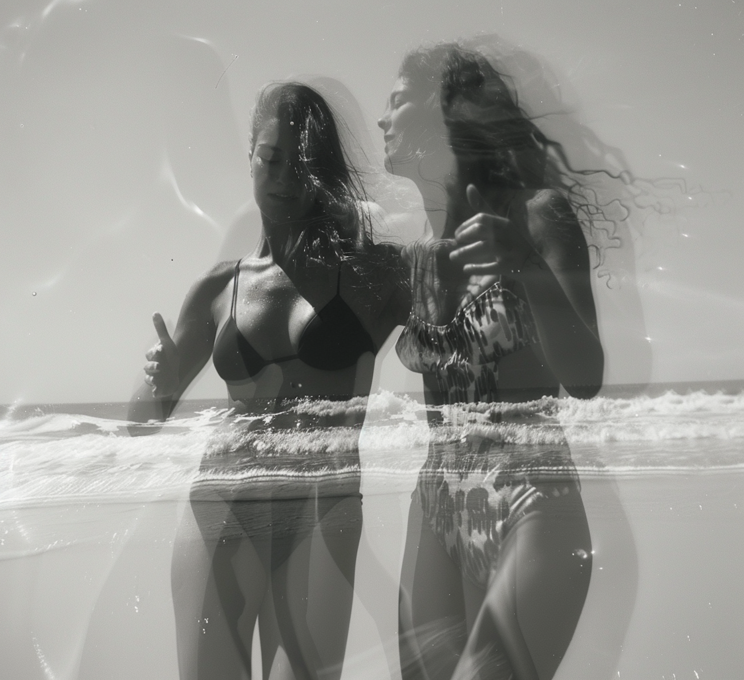 Double exposure of two women at the beach, blending with ocean waves, creating a dreamy, ethereal effect.