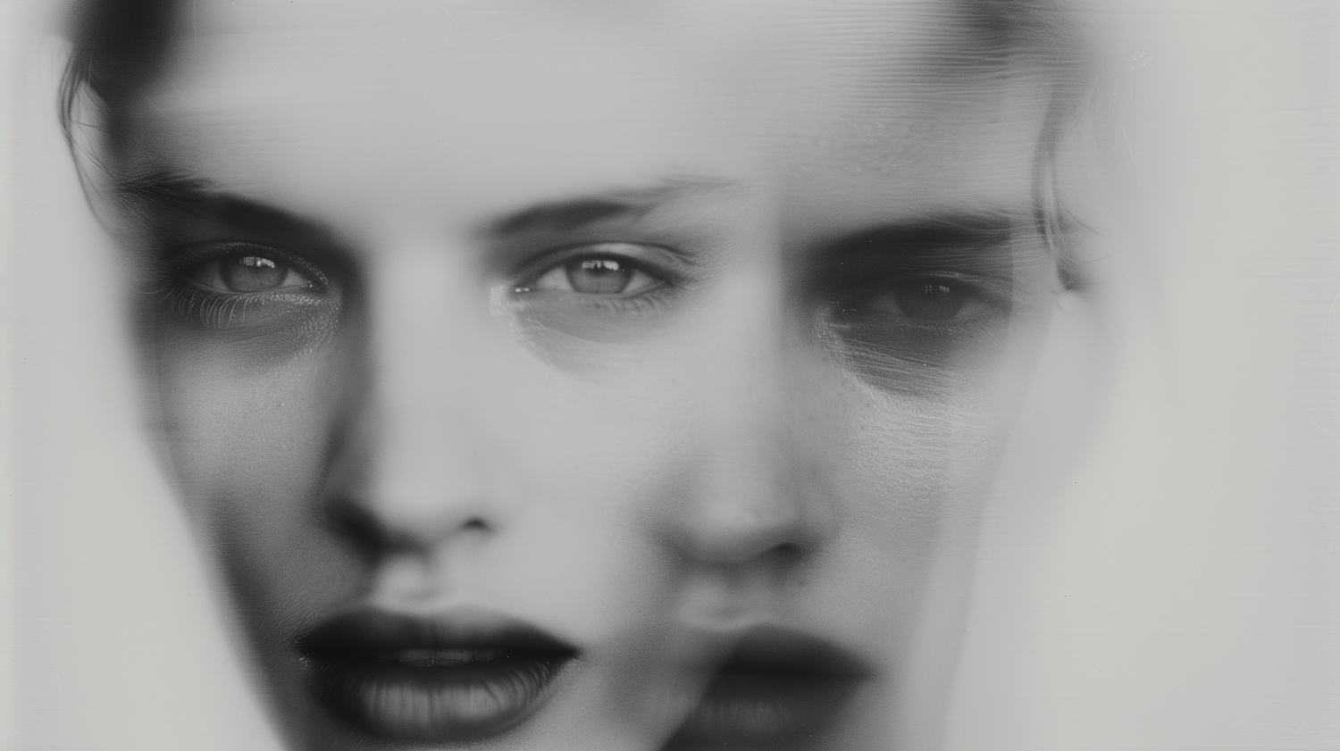 Black-and-white double exposure of a woman's face with intense eyes and parted lips, creating a surreal and artistic effect.