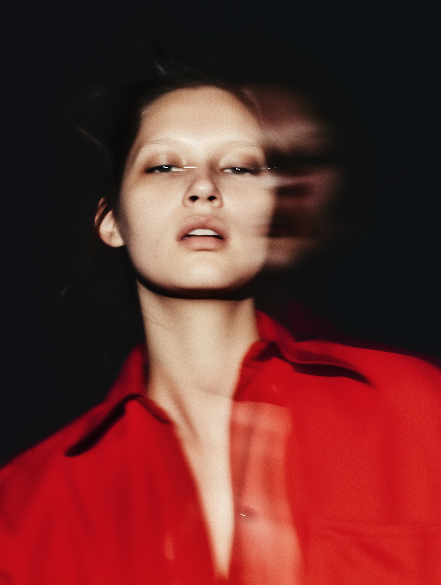 Artistic portrait of a woman in a red shirt with a blurred double-exposure effect, set against a dark background.