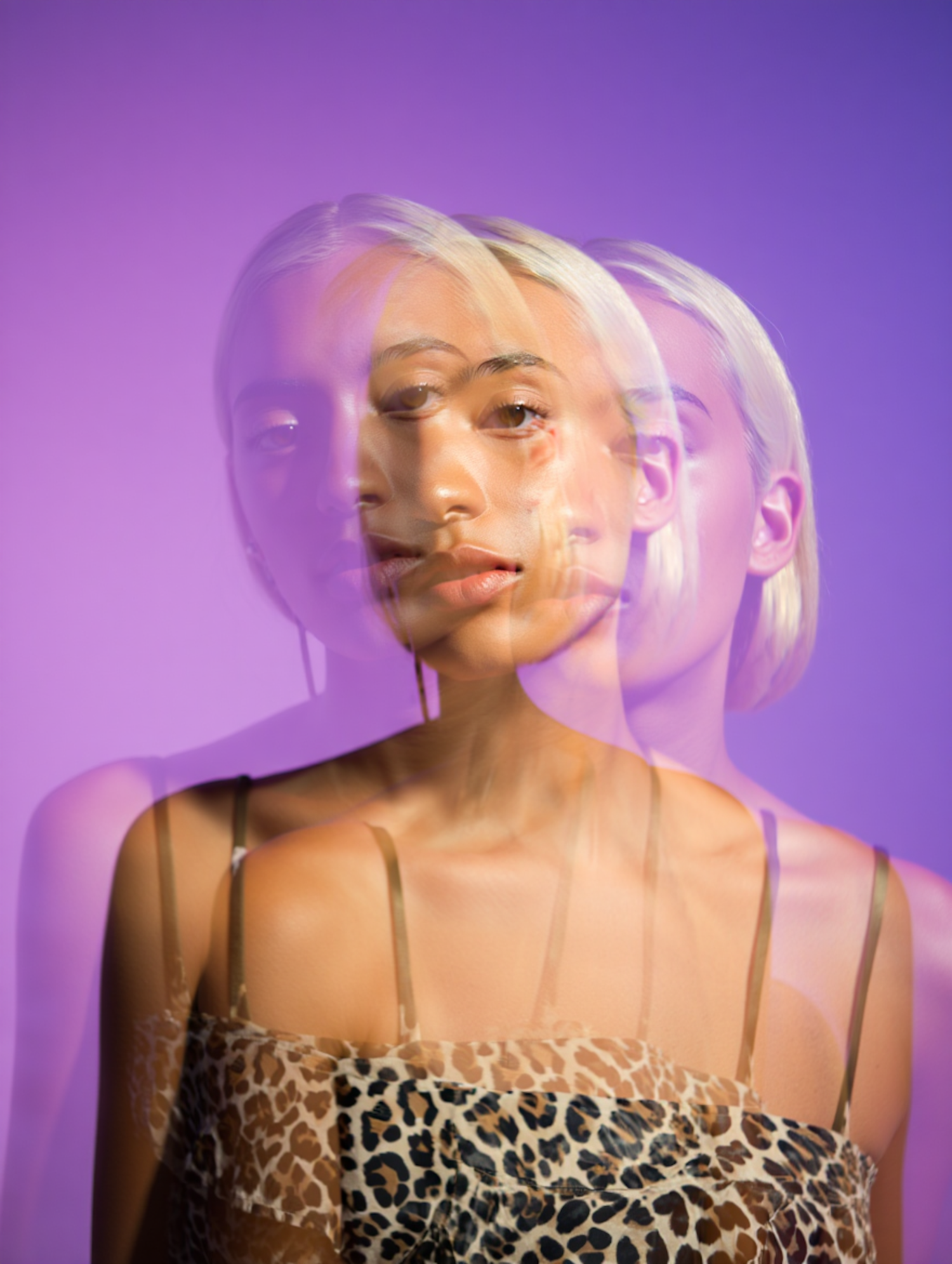 Artistic double-exposure portrait of a woman with platinum blonde hair, leopard-print top, and a purple gradient background.