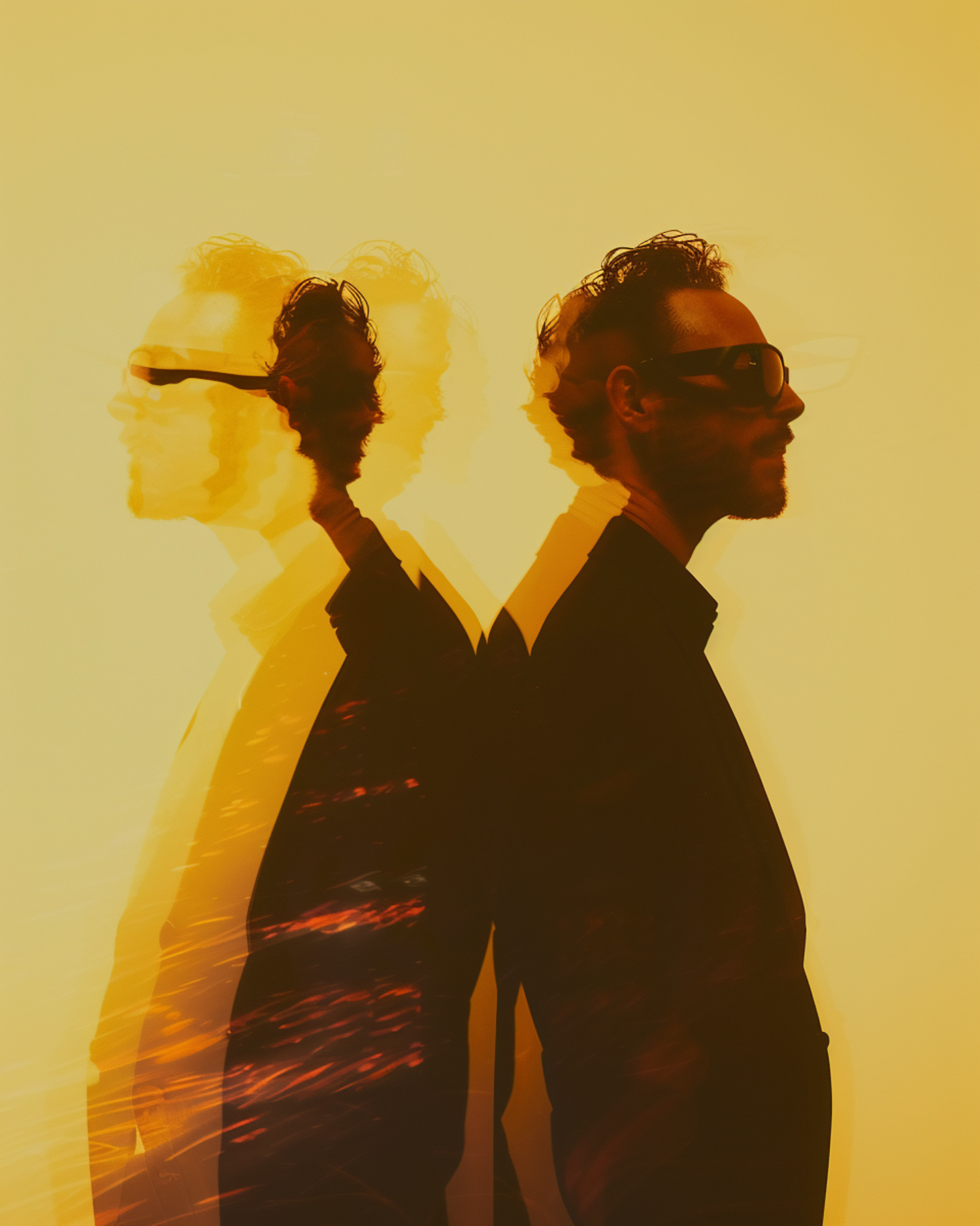 Double exposure of a man in sunglasses with a yellow background, creating a surreal and artistic layered effect.