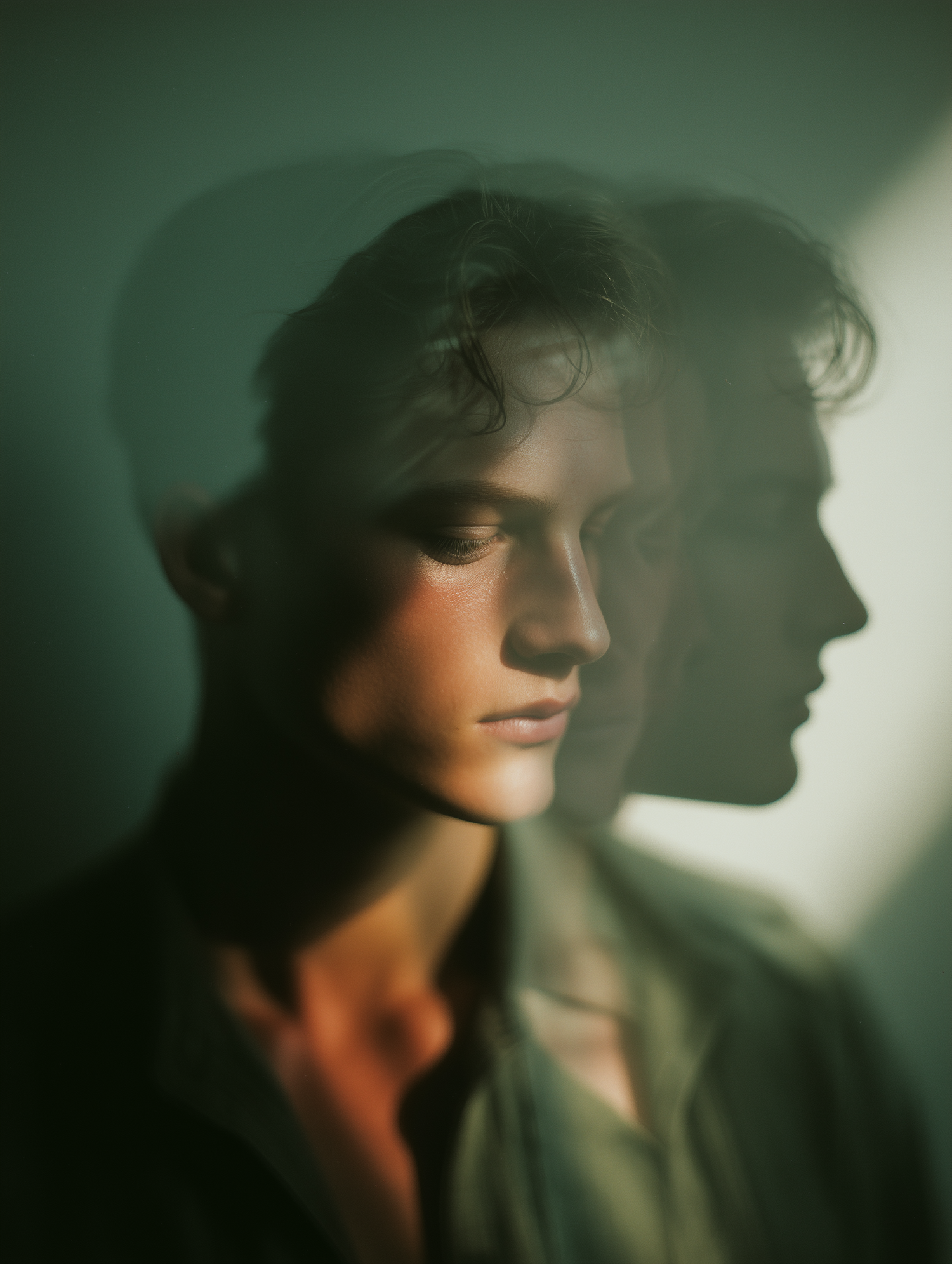 Artistic portrait with a double exposure effect, featuring a contemplative subject in soft lighting against a muted green background.