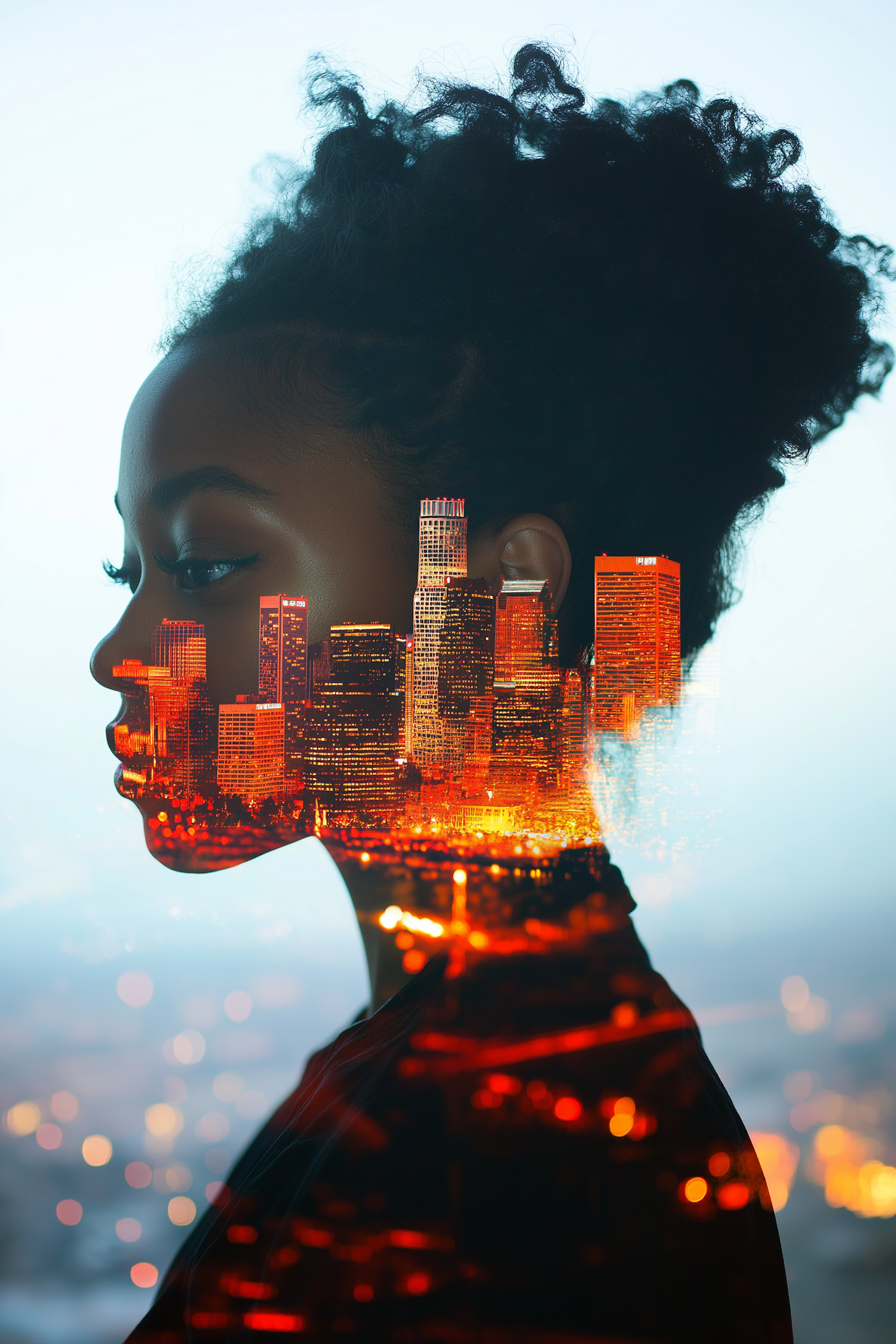 Double exposure of a woman's profile with a vibrant cityscape, blending human and urban elements in a striking artistic composition.