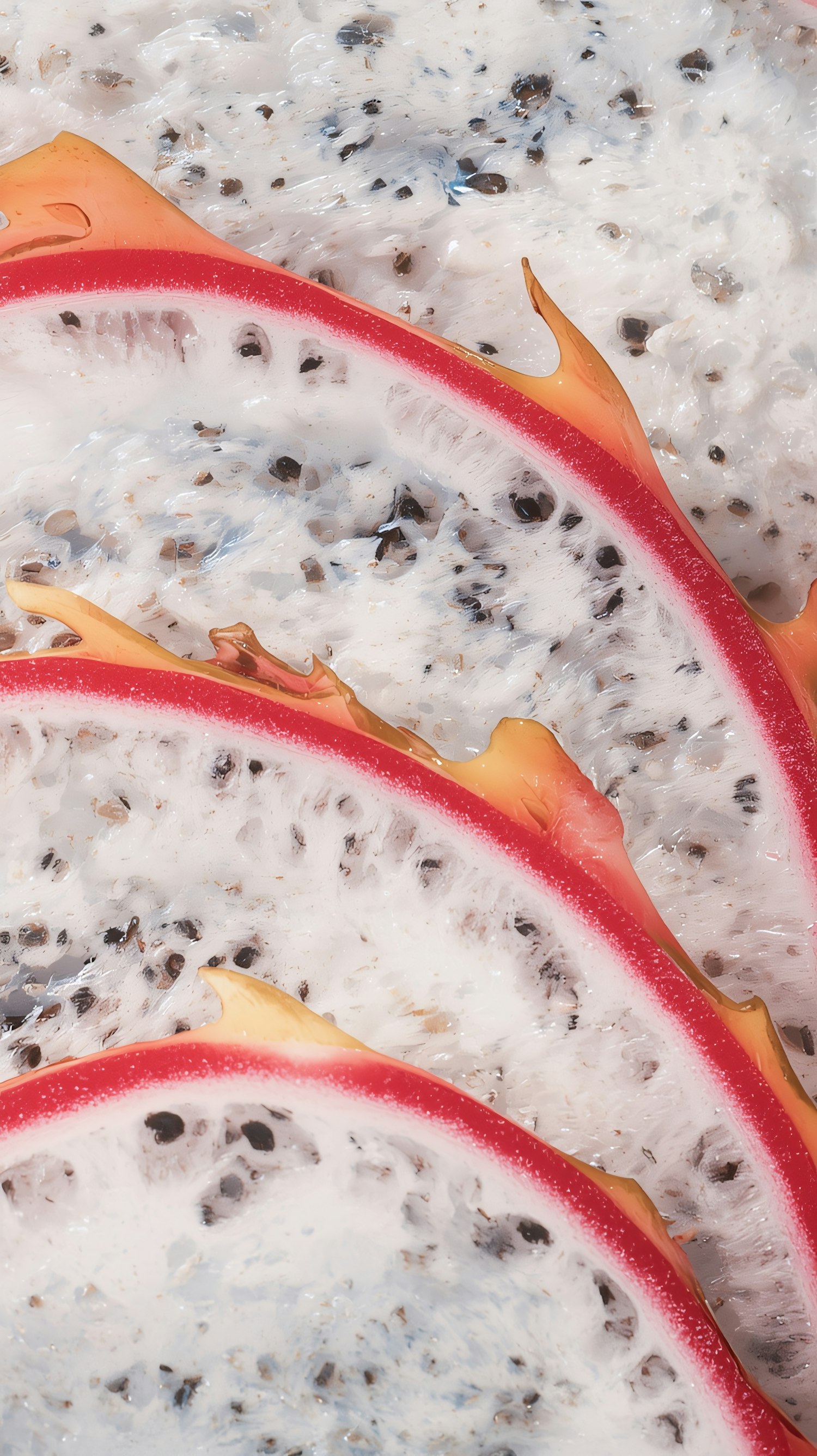 Close-up of sliced dragon fruit with vibrant red skin and white flesh speckled with black seeds, showcasing its fresh and juicy texture.