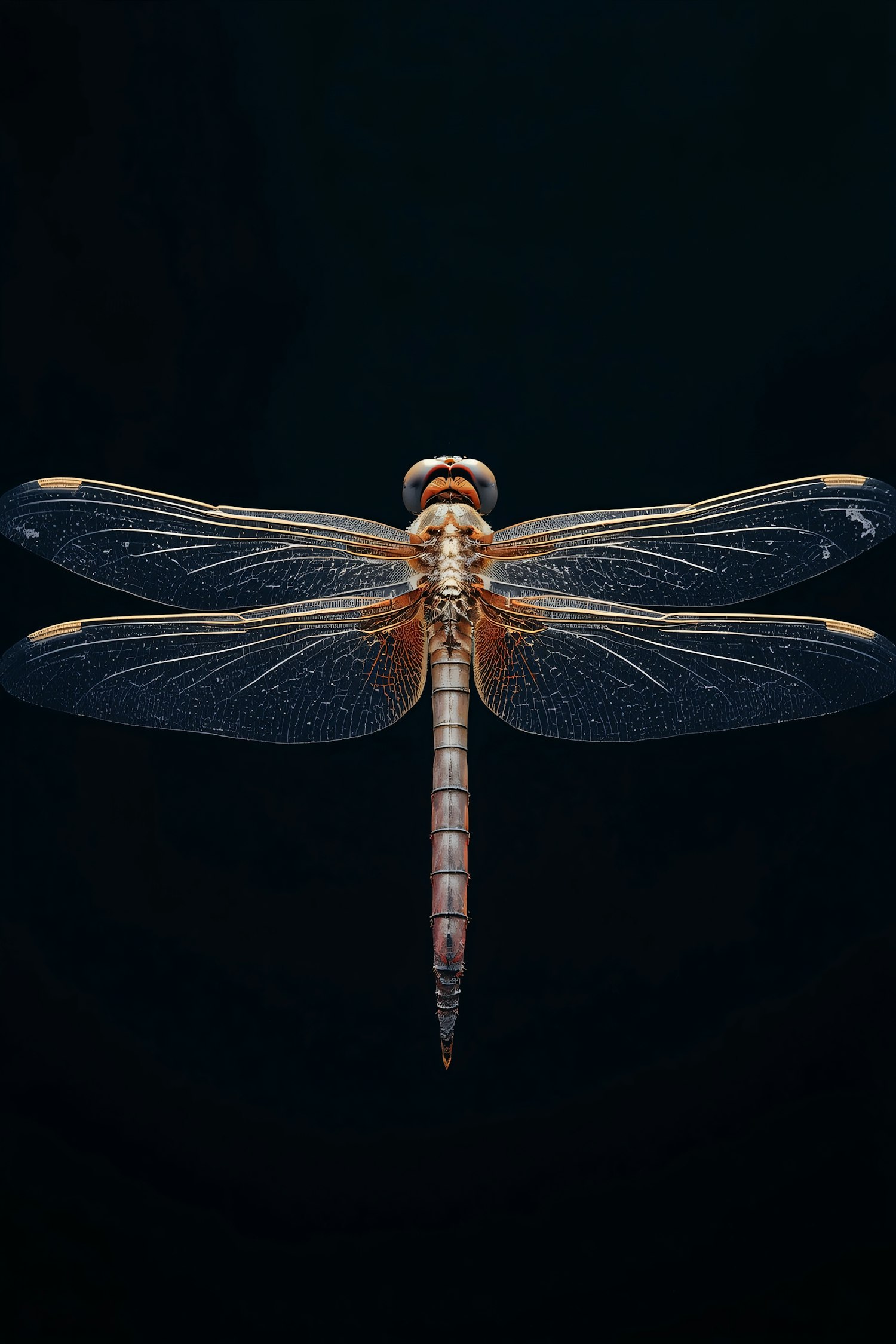 A detailed close-up of a dragonfly with its wings spread, showcasing intricate patterns and vibrant colors against a black background.