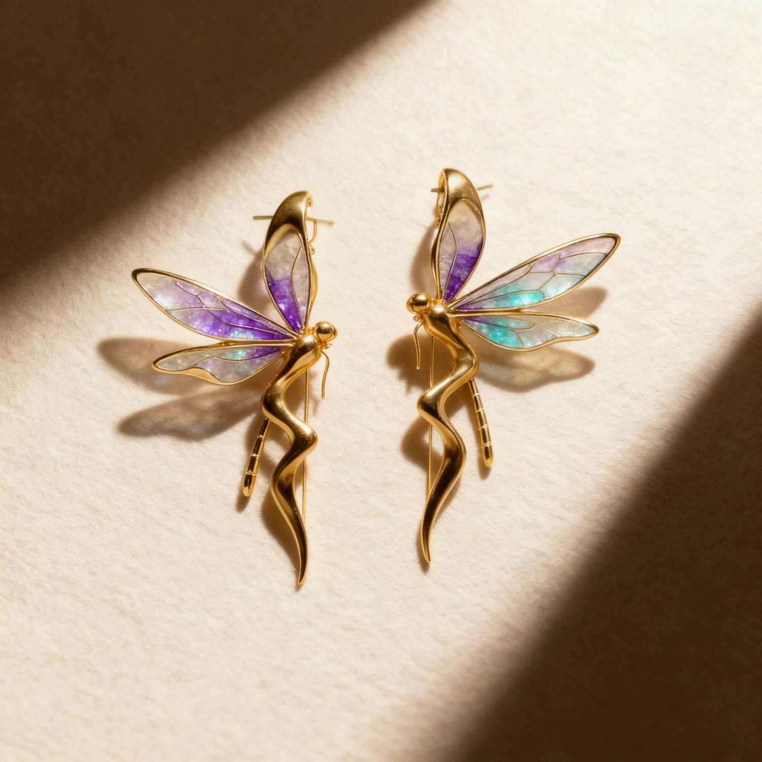Elegant dragonfly-shaped earrings with gold bodies and colorful wings, beautifully lit on a neutral background.