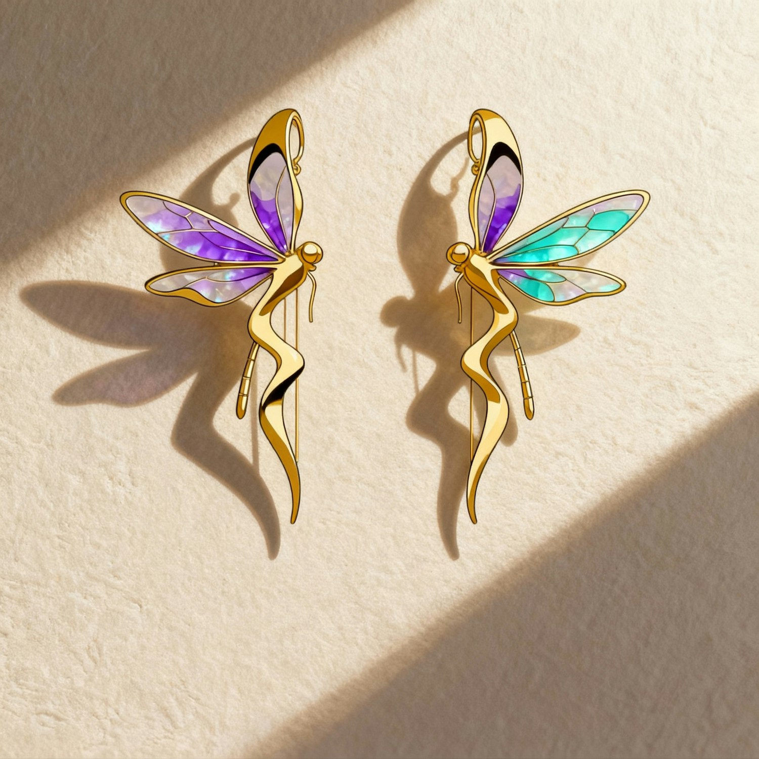 Elegant gold dragonfly earrings with colorful translucent wings, displayed on a textured beige surface with soft natural light shadows.