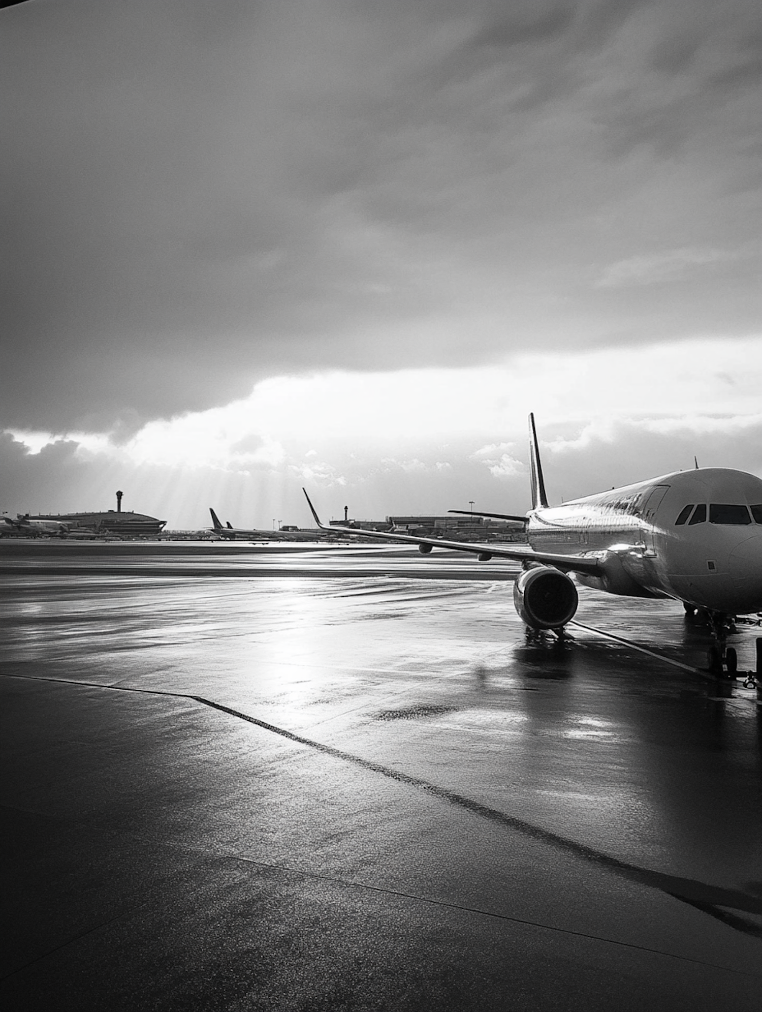 Dramatic black-and-white airport scene with a parked airplane on a wet runway, sunlight breaking through heavy clouds in the background.
