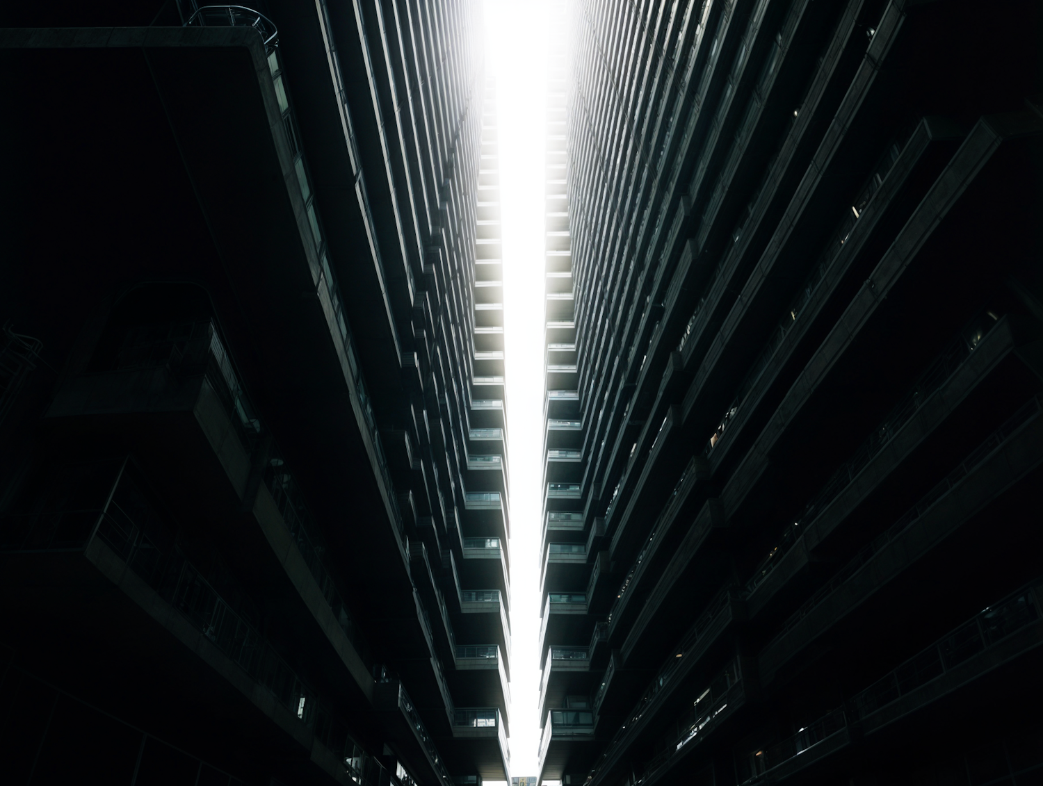 Dramatic upward view of skyscrapers with a bright light above, creating a canyon-like effect between dark, towering structures.
