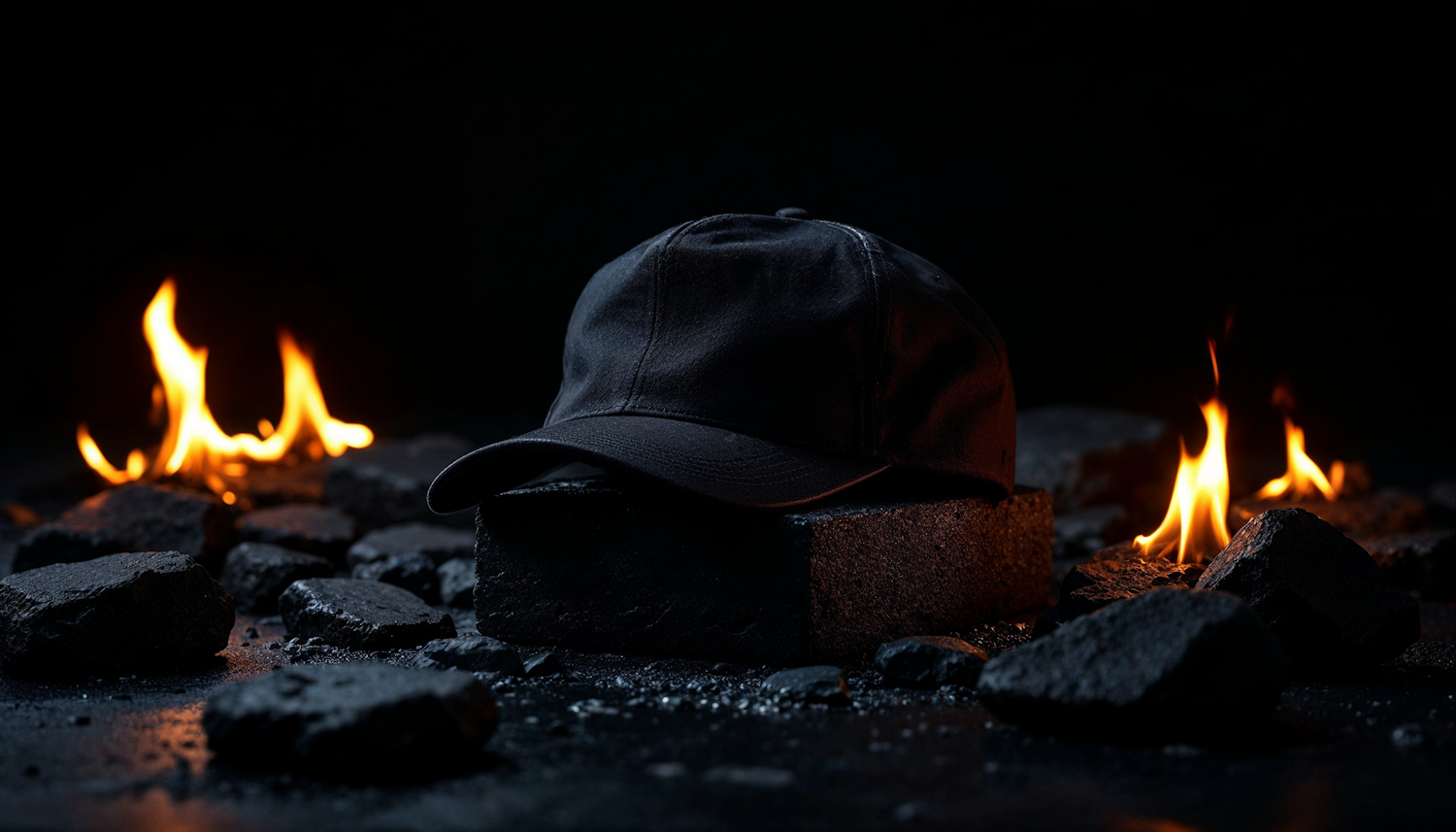 Black baseball cap on a block surrounded by rocks and flames, creating a dramatic and intense scene with contrasting light and shadow.