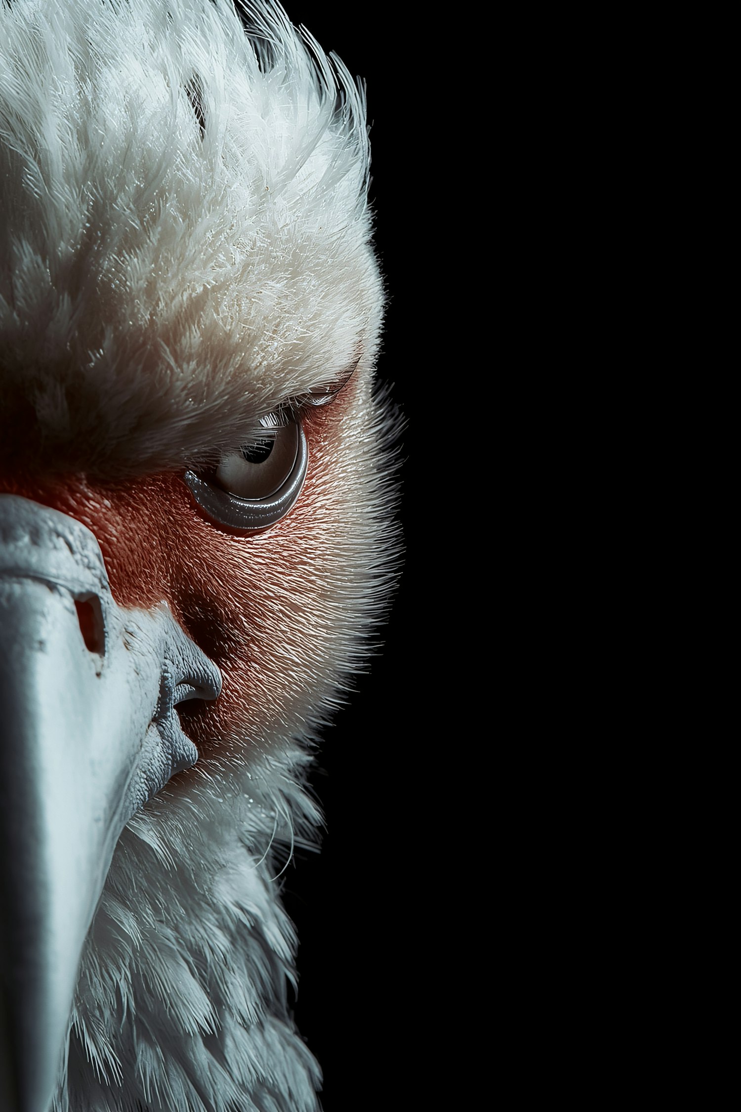 Close-up of a bird's face with detailed feathers, sharp eye, and prominent beak against a black background.