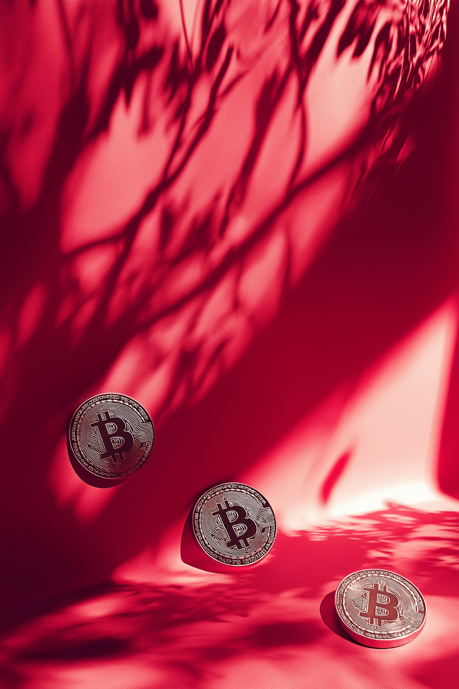 Three Bitcoin coins on a vibrant red background with dramatic shadows and intricate patterns.