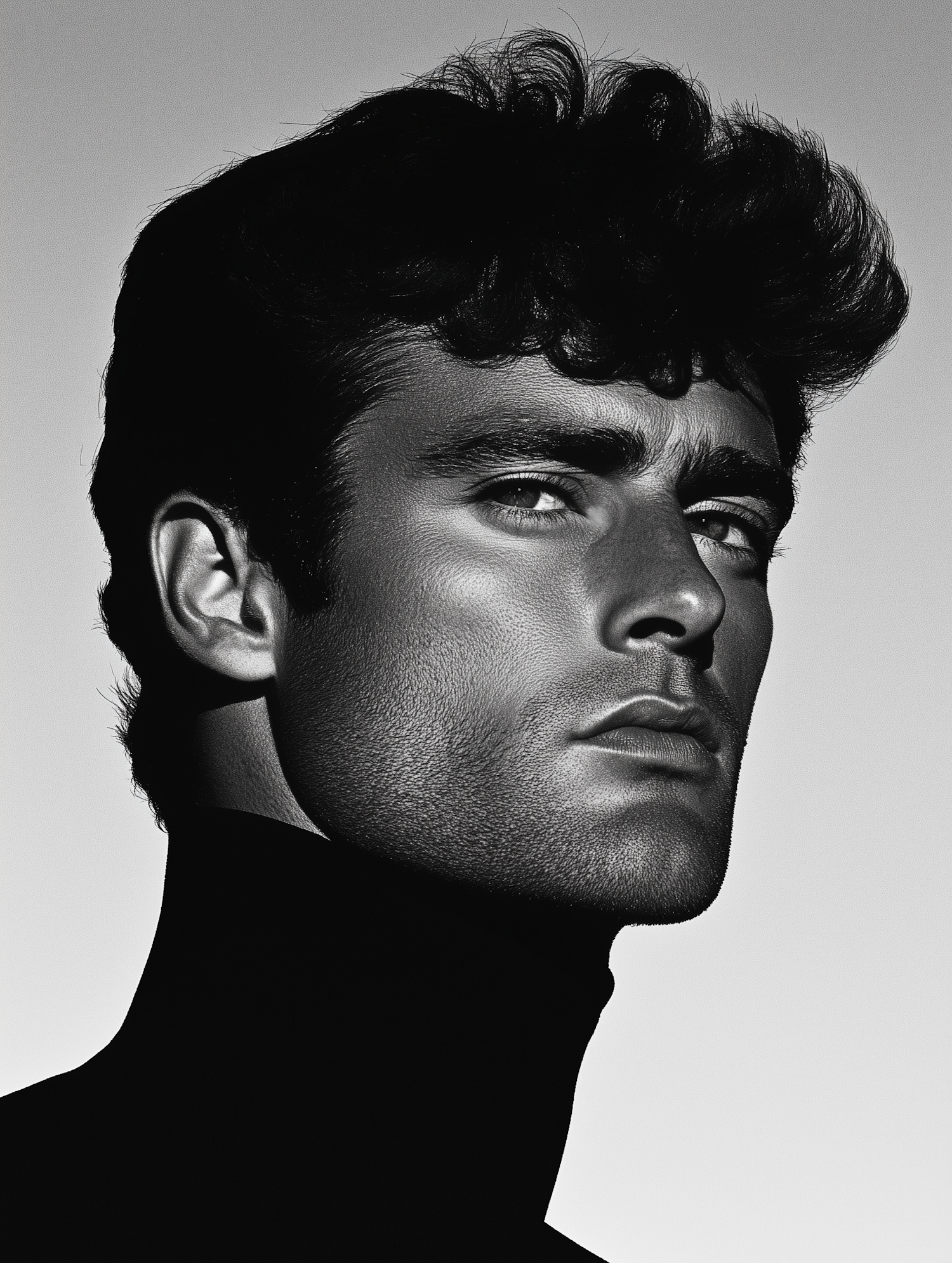 Striking black and white portrait of a man with a strong jawline and voluminous hair, wearing a high-neck black garment.
