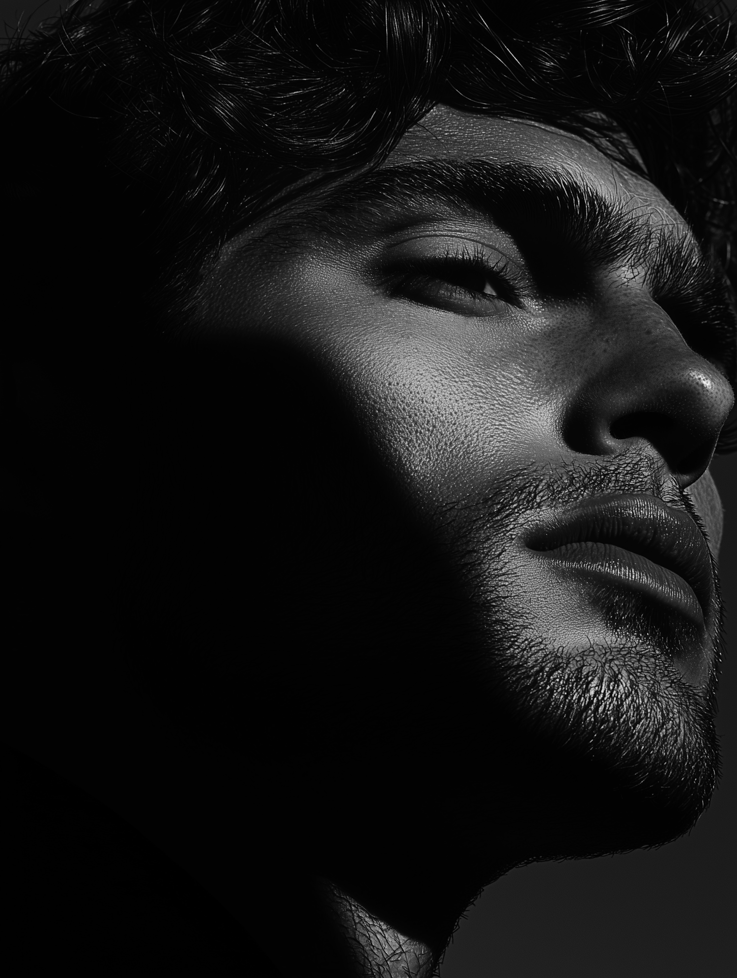 Dramatic black and white portrait of a man with strong features and intense shadows, highlighting his contemplative expression.