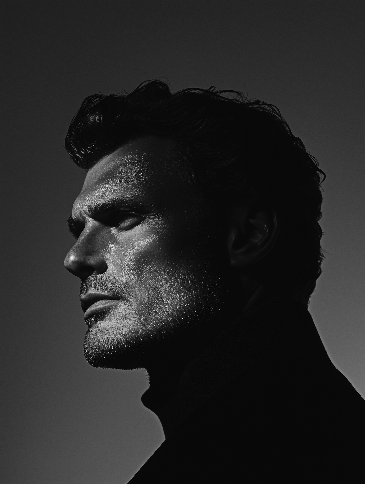 Dramatic black and white portrait of a man with rugged features and intense expression, highlighted by stark lighting and deep shadows.