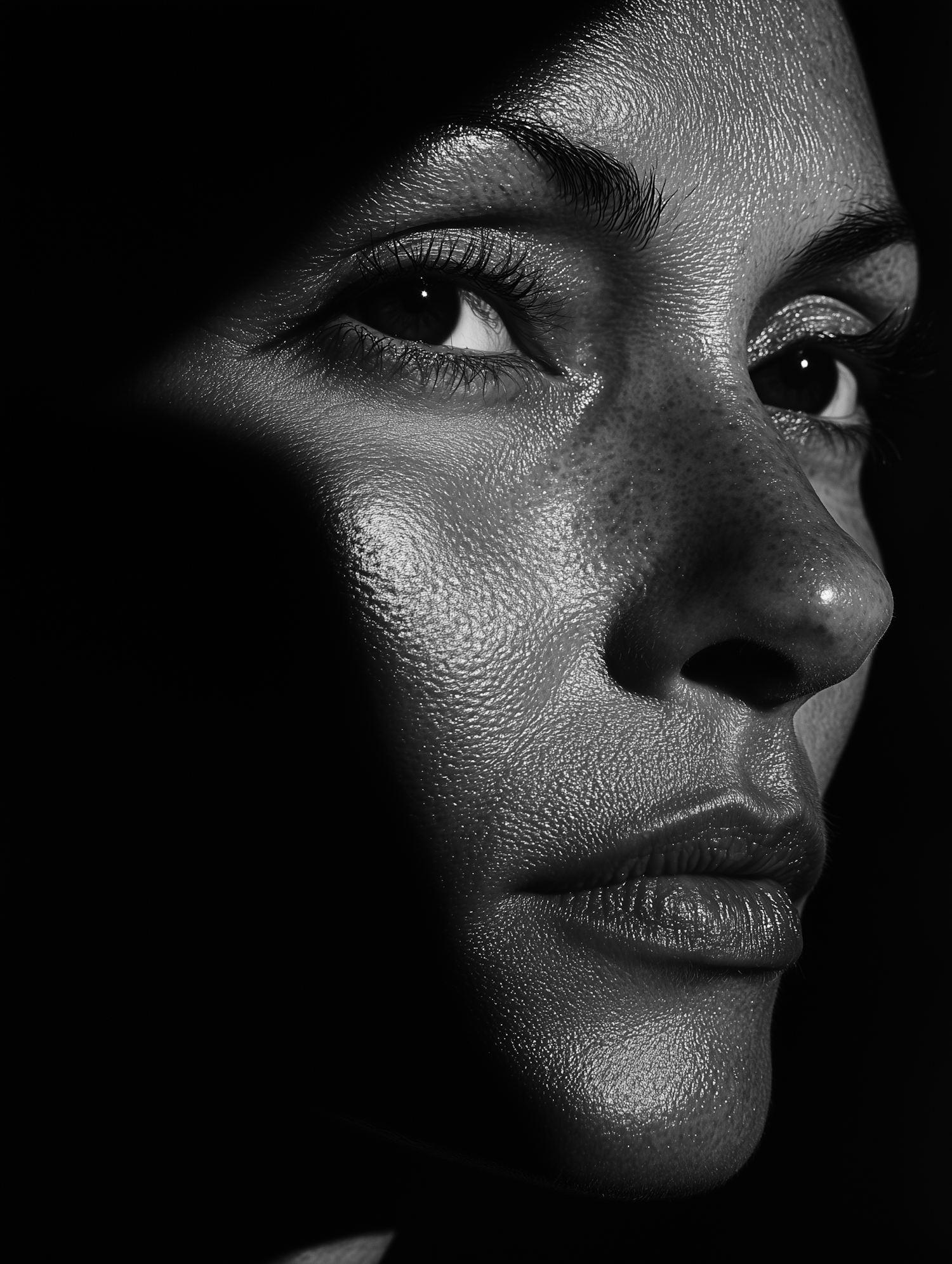 Dramatic black and white close-up of a woman's eye and face, highlighting skin texture and intense expression.