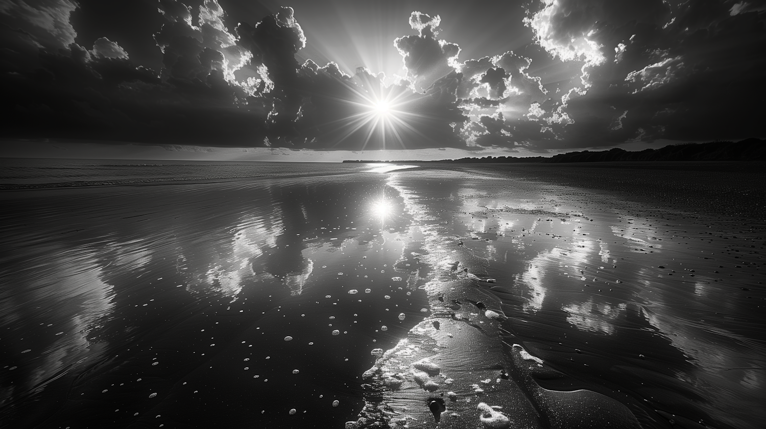 Dramatic black-and-white beach scene with radiant sun rays, reflective wet sand, textured clouds, and distant land silhouette.