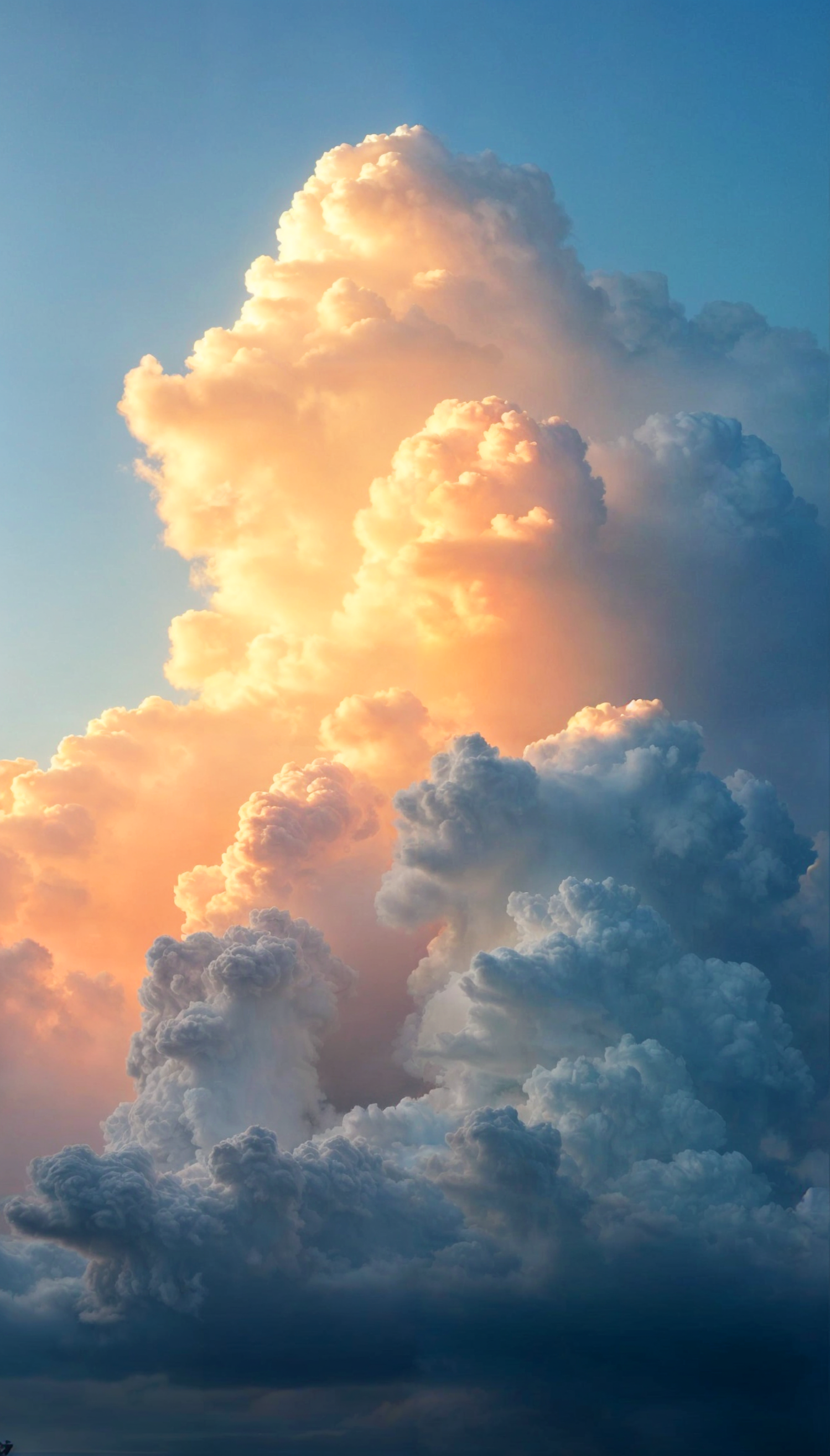 Majestic cumulus clouds illuminated by golden sunlight against a clear blue sky, creating a dramatic and serene scene.