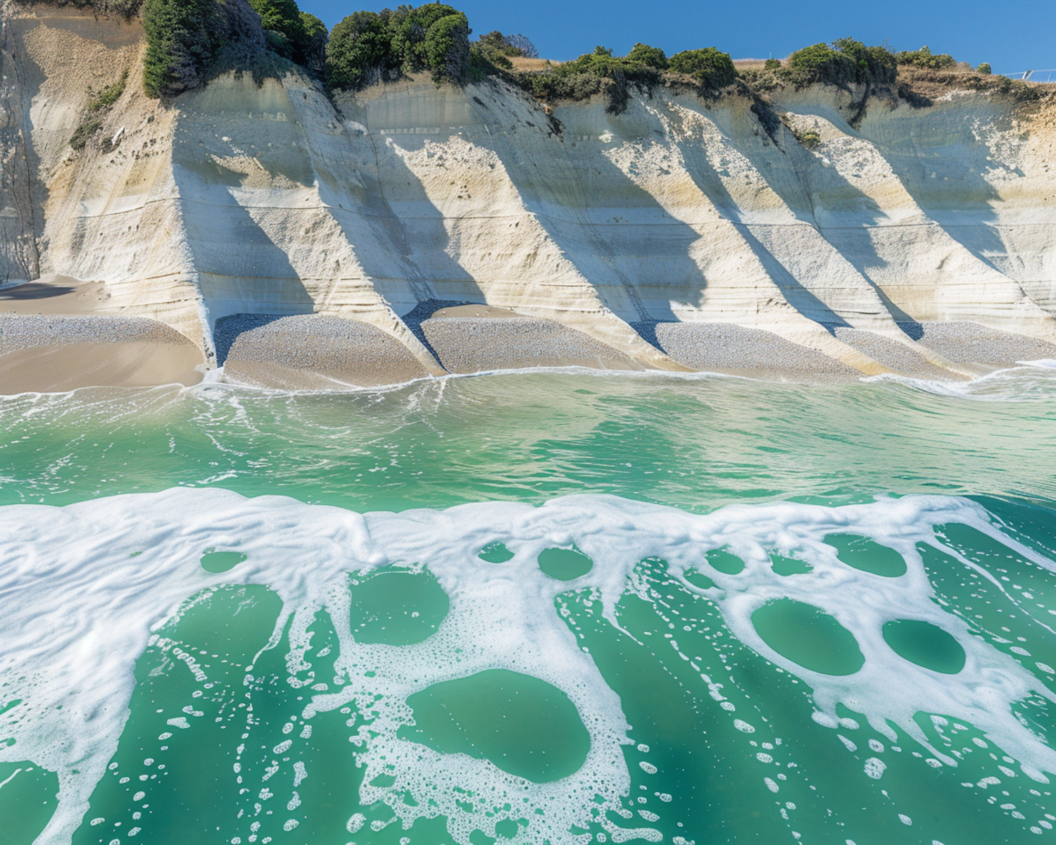 Dramatic white cliffs meet turquoise sea with frothy waves, under a clear blue sky. A stunning coastal landscape with vibrant contrasts.