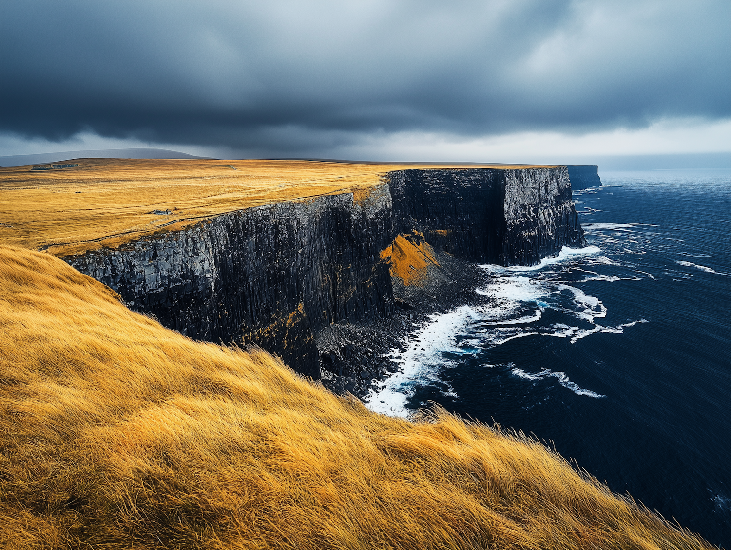 Golden grass meets dramatic cliffs plunging into a dark ocean under a moody, overcast sky. Waves crash below, creating a striking contrast.