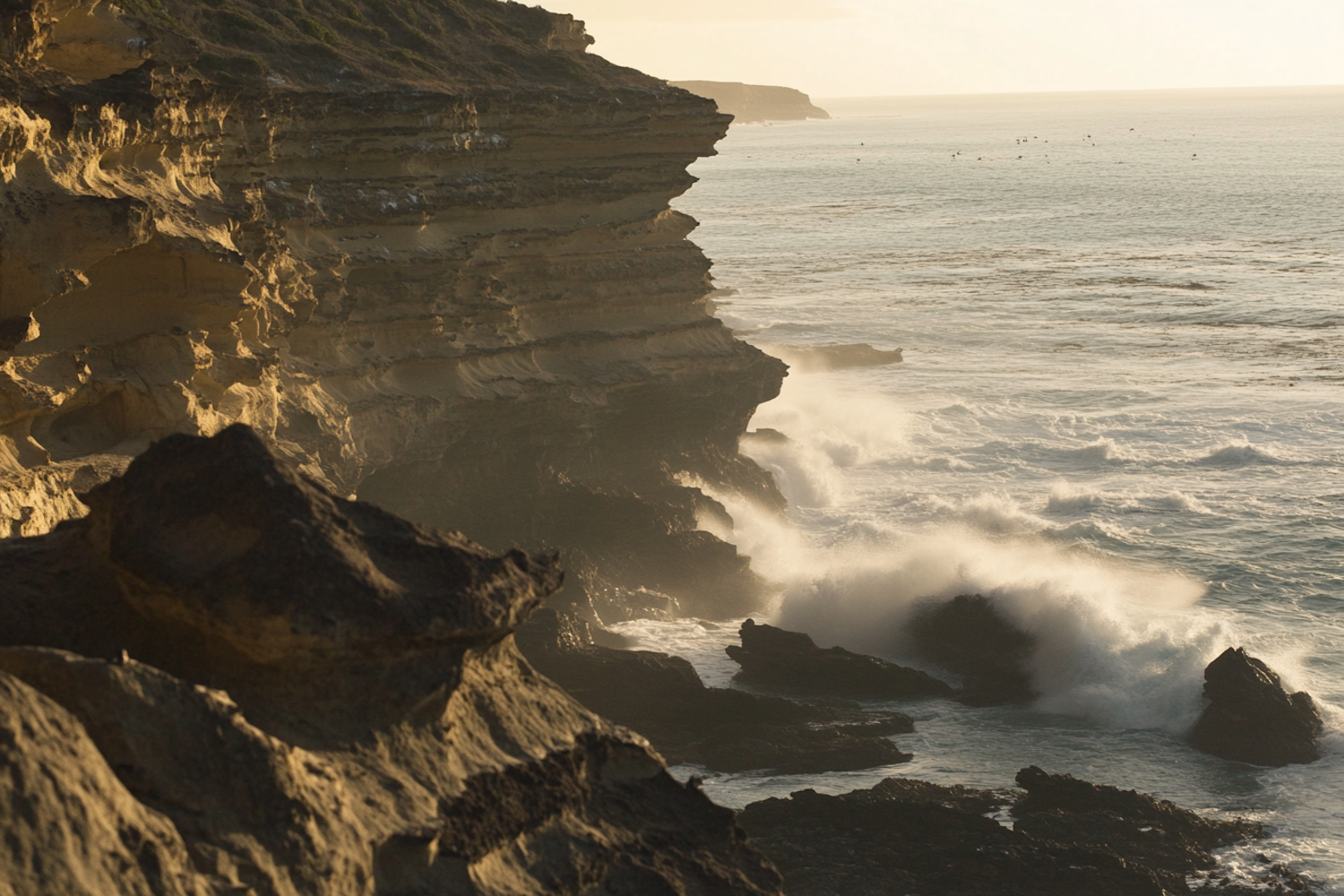 Dramatic coastal cliffs with crashing waves and golden sunlight, showcasing nature's raw beauty and power.
