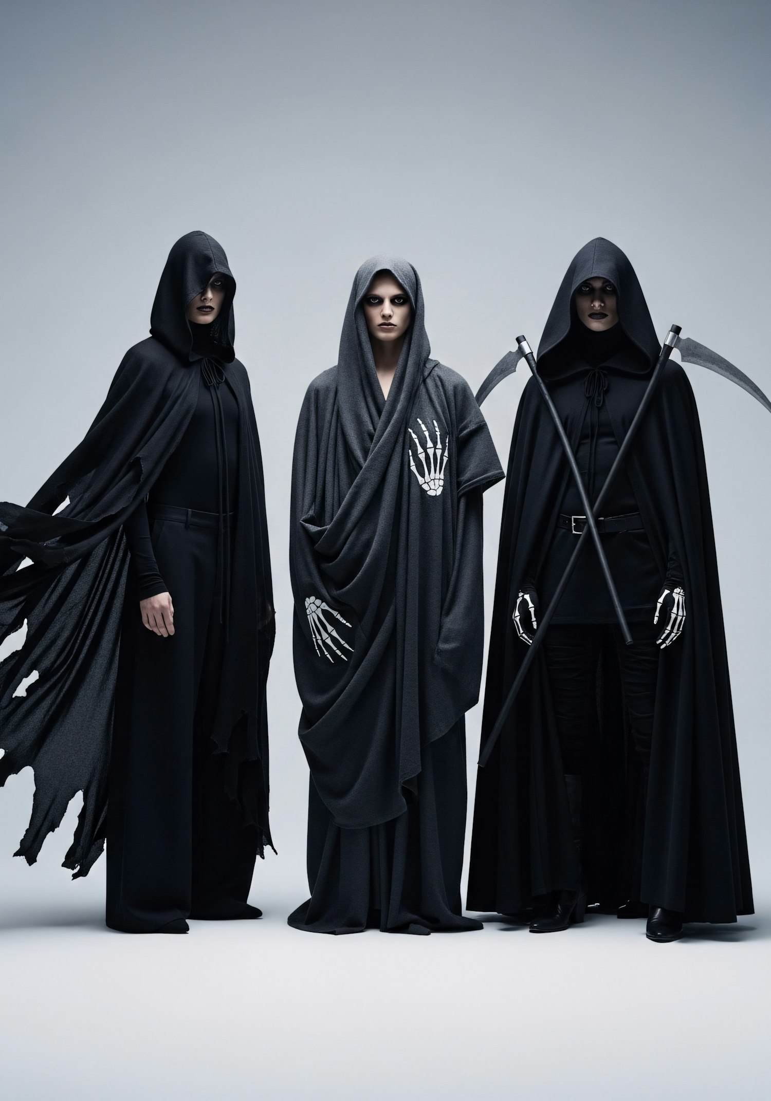 Three figures in dark, hooded costumes with skeletal designs and scythes, creating a dramatic and mysterious visual.