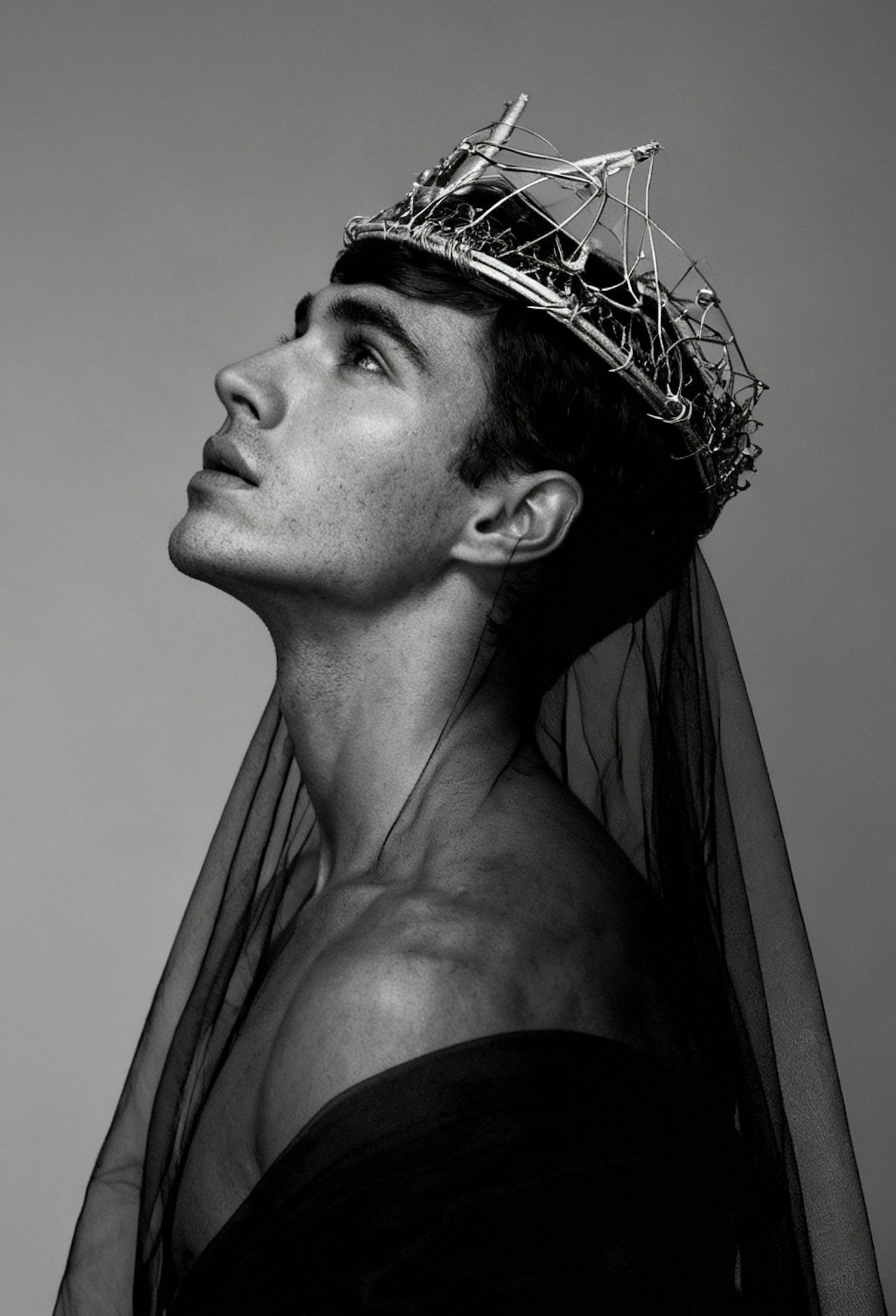Black-and-white portrait of a person wearing a wire crown and sheer fabric, gazing upwards with a dramatic and artistic expression.
