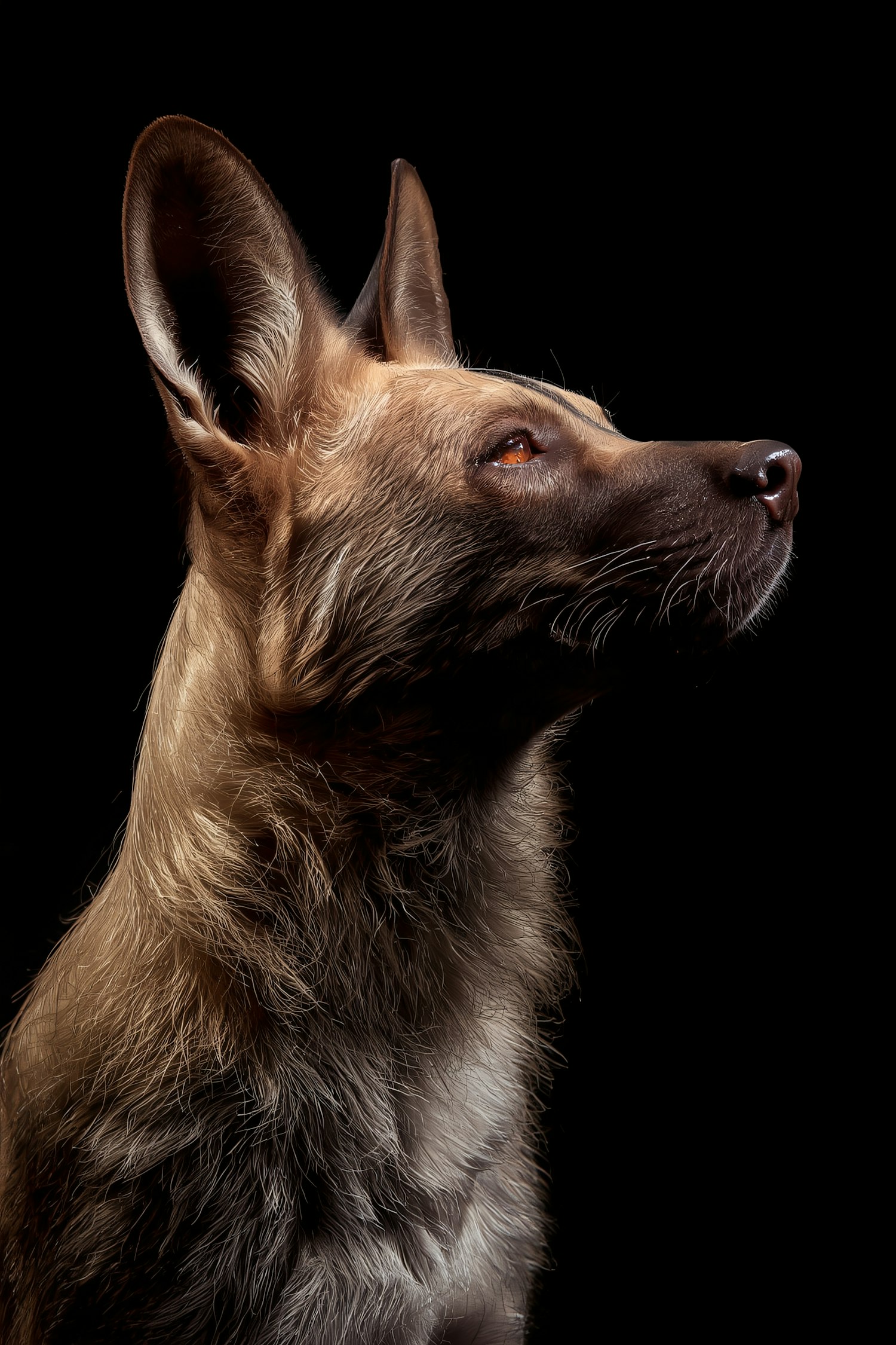 A striking close-up of a dog with light brown fur and large ears, dramatically lit against a black background, showcasing its profile.