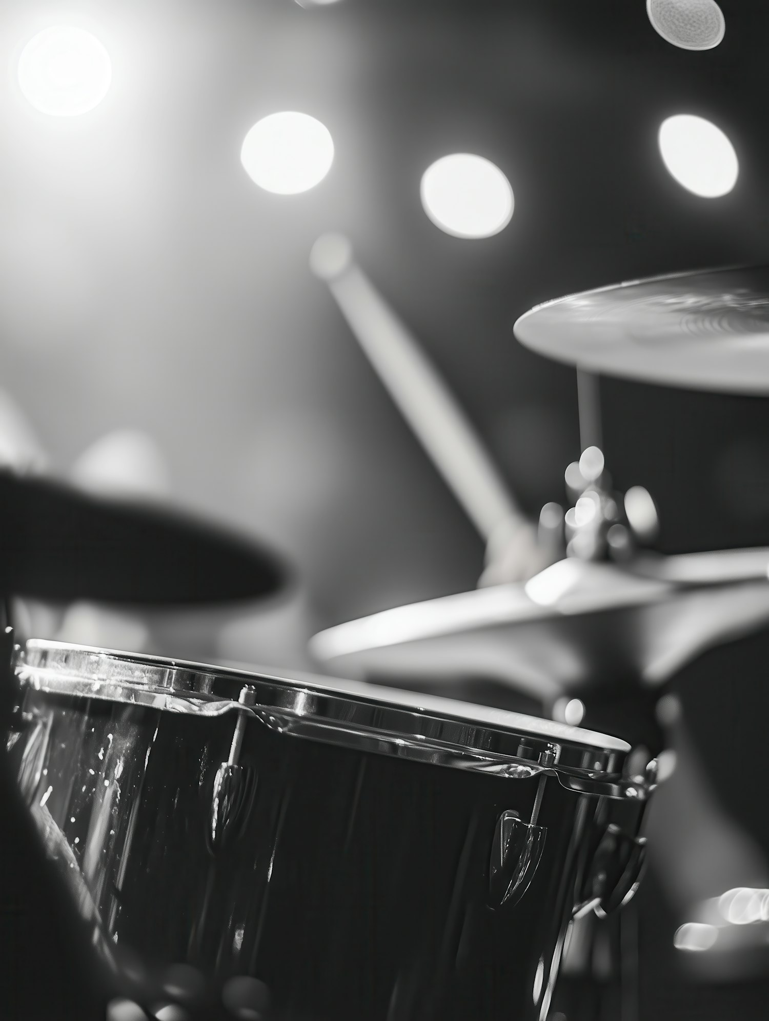 Black and white close-up of a drum set with snare and cymbals, featuring stage lights and a dynamic performance vibe.
