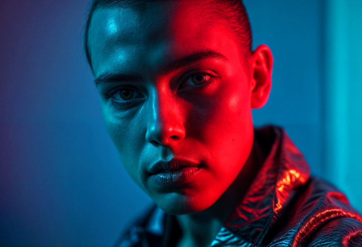 Dramatic portrait with contrasting blue and red lighting, highlighting facial features and a metallic jacket for a futuristic look.