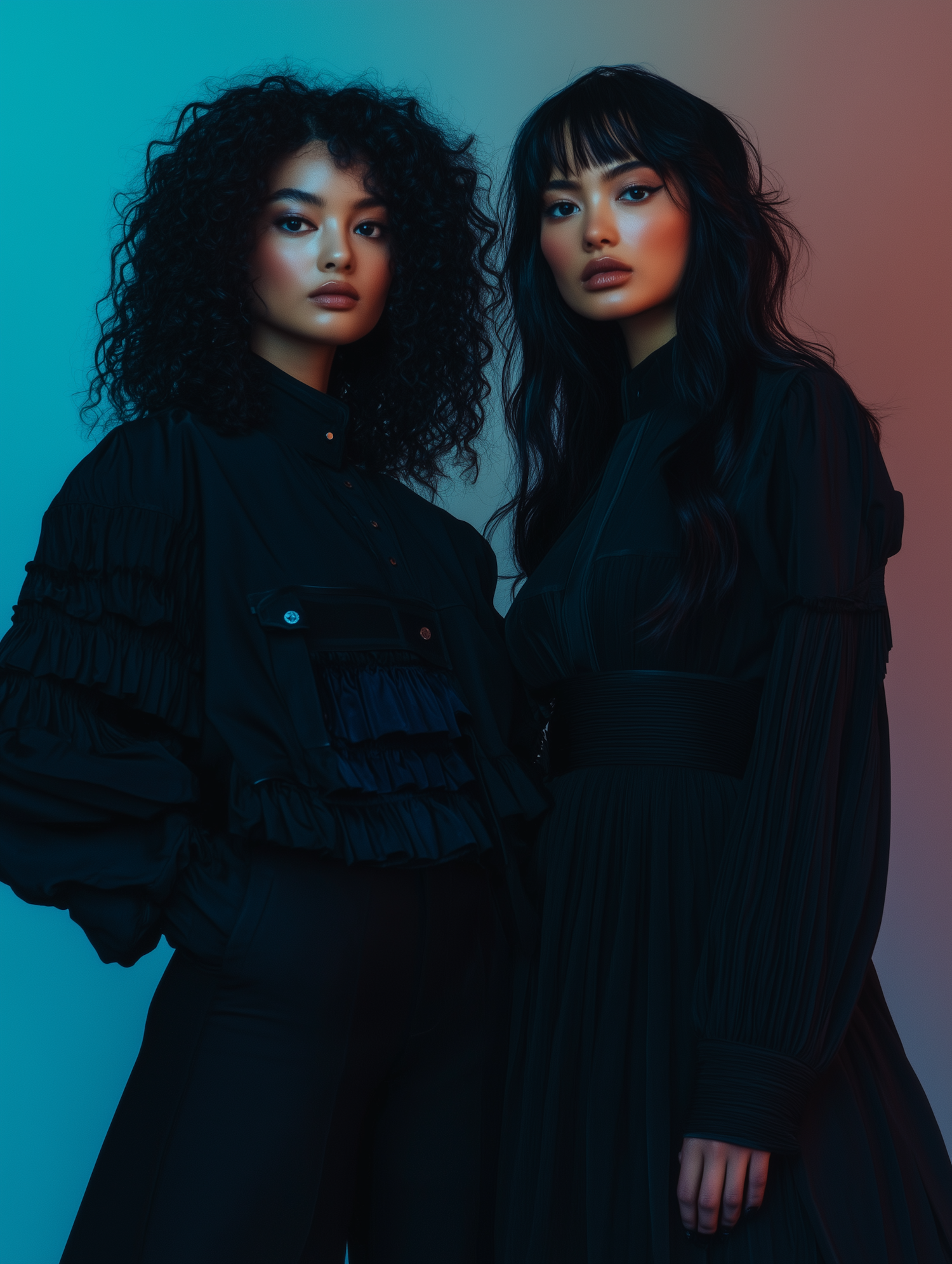 Two women in stylish black outfits pose against a blue-to-red gradient background, showcasing dramatic lighting and bold fashion.